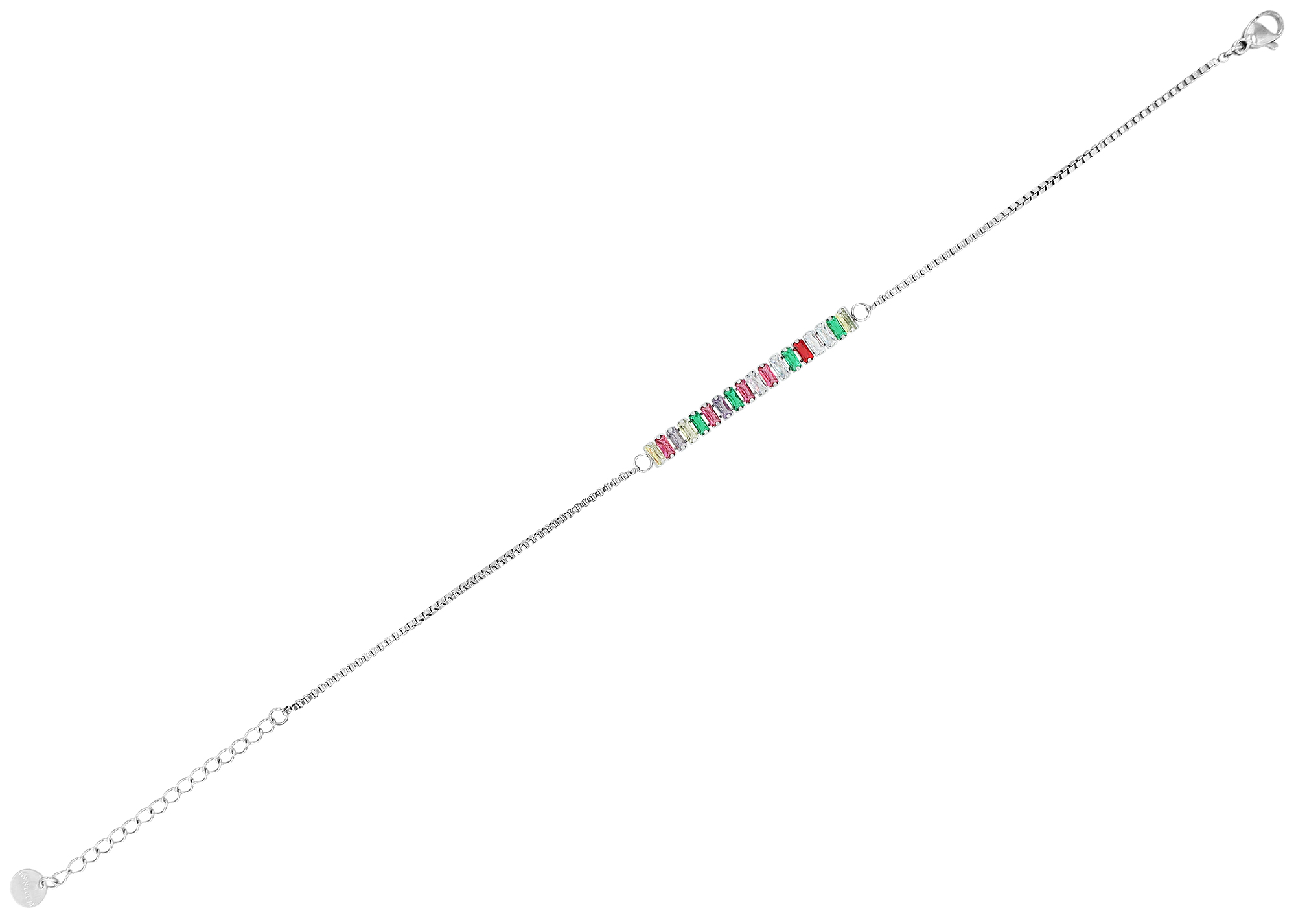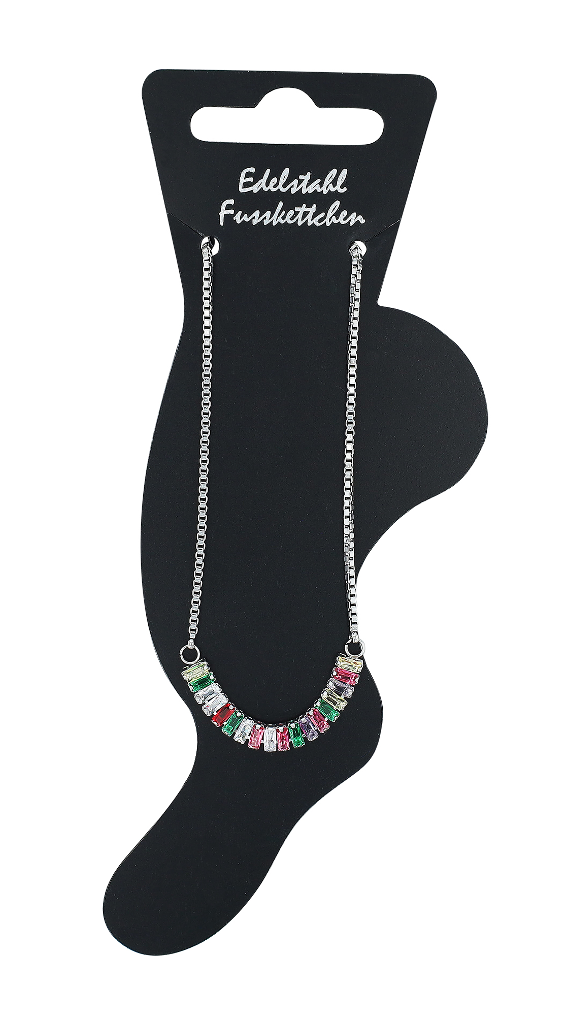 De enkelband van het merk Akzent is gemaakt van roestvrij staal in een Venetiaans patroon en versierd met achttien kleurrijke zirkonia steentjes in het midden. De enkelband kan worden geopend en gesloten met een karabijnsluiting, die ook van roestvrij staal is gemaakt. Een verlengkettinkje van 5 cm aan één uiteinde van de enkelband maakt het mogelijk de lengte te variëren, zodat de enkelband aan elke enkel kan worden aangepast. De afmetingen resulteren uit een lengte van 21 cm en een kettingdikte van 2 mm. Het zirkonia element is 5 mm breed, 50 mm lang en heeft een materiaaldikte van 3 mm.