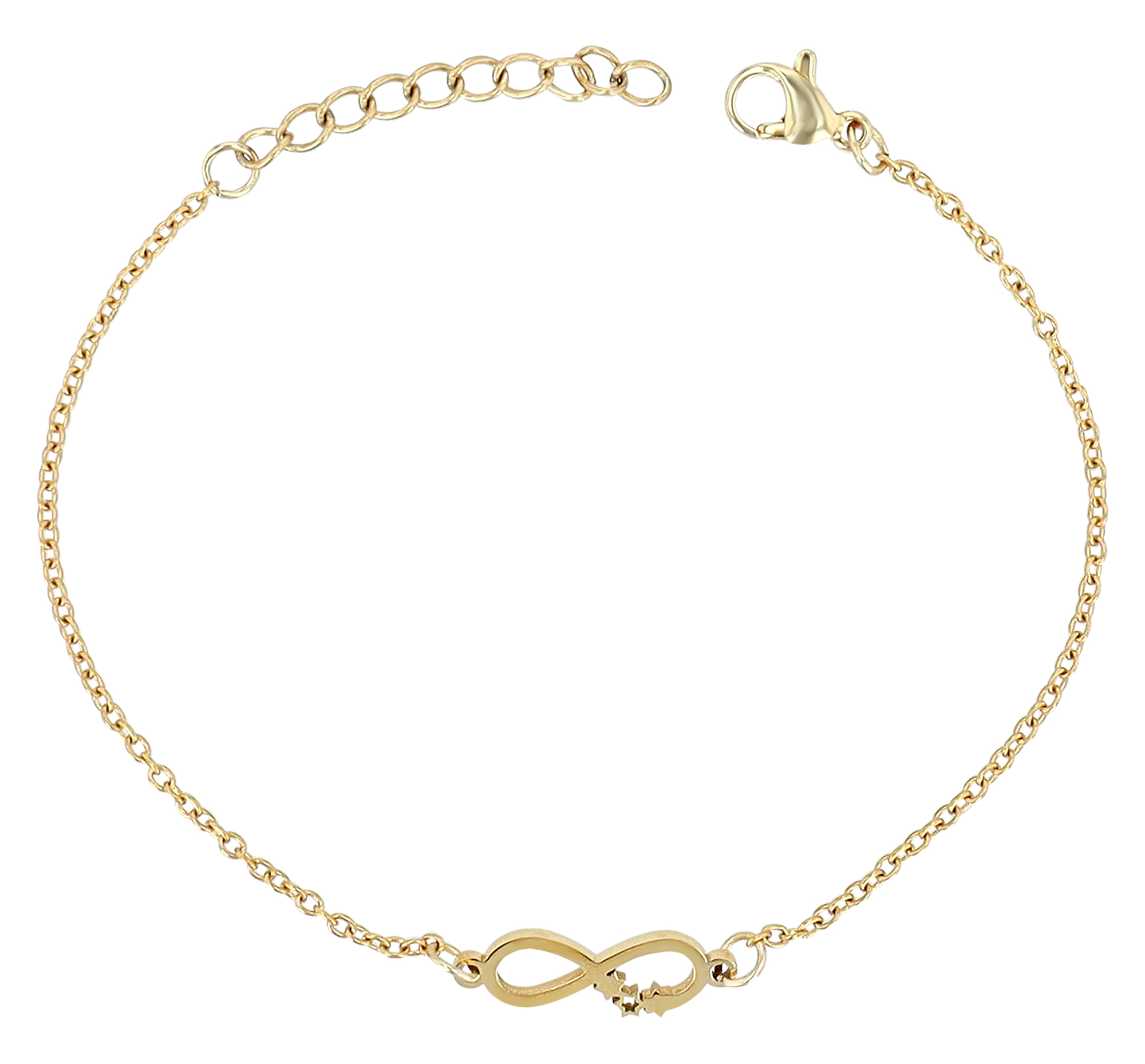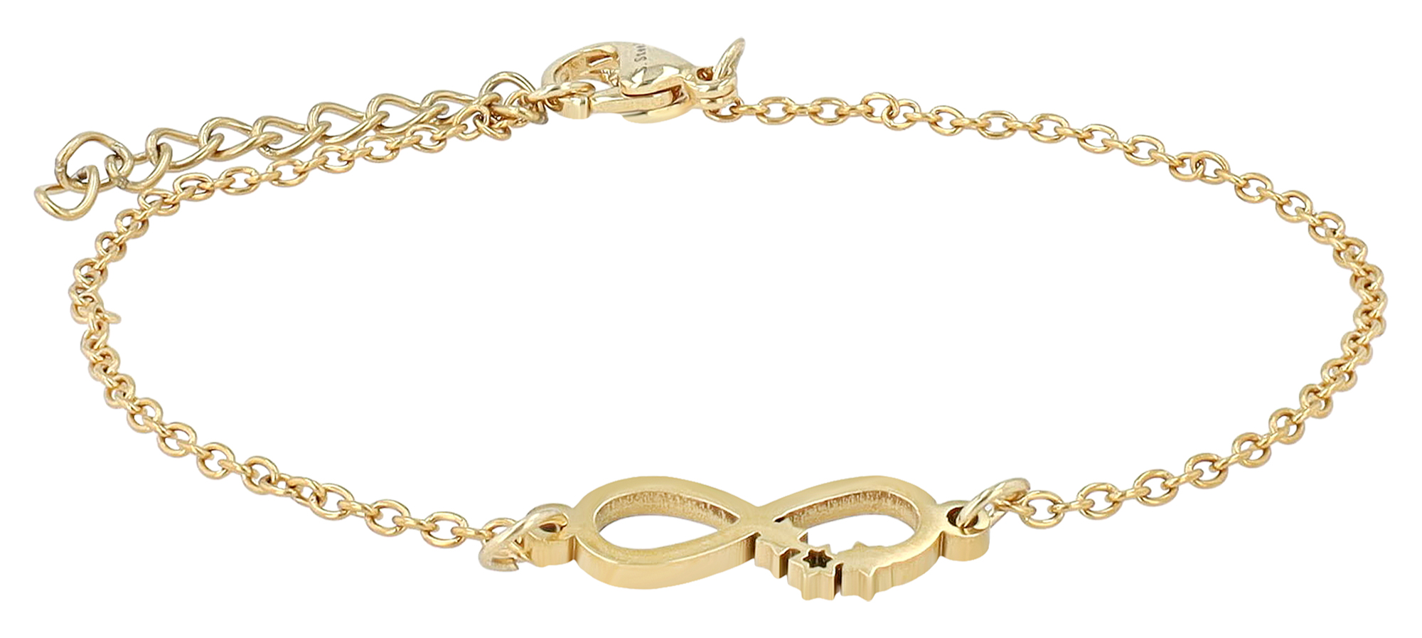 De modieuze armband van het merk Akzent is gemaakt van hoogwaardig roestvrij staal en is vervaardigd in het populaire ankerkettingpatroon en is verkrijgbaar in drie betoverende kleurvarianten, zilverkleurig, roségoudkleurig en goudkleurig. In het midden van de armband zit een roestvrijstalen hanger in de vorm van een oneindigheidssymbool met drie sierlijke sterretjes rechtsboven(hoogte 6 mm, breedte 19 mm, dikte 1,5 mm). Het oneindigheidselement vertegenwoordigt het idee van oneindigheid en eeuwigheid. Het herinnert ons eraan dat onze banden met andere mensen en onze liefde geen einde kennen. Dit nobele symbool geeft de armband een speciale betekenis.