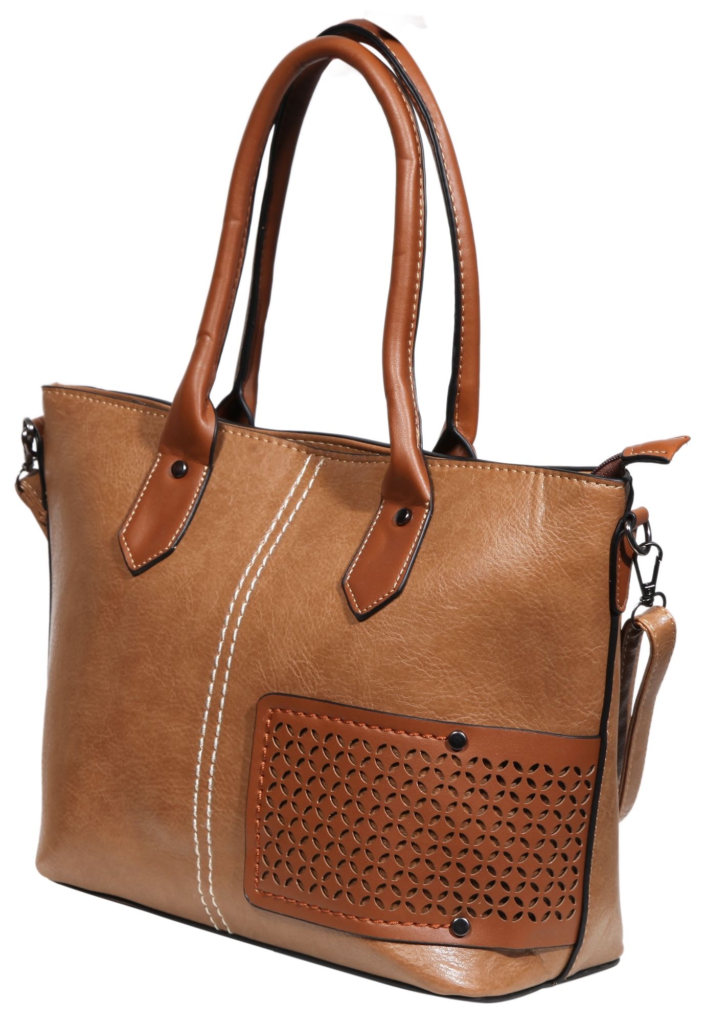 De dameshandtas is gemaakt van imitatieleer en het hele oppervlak heeft een gladde textuur. De tas heeft twee korte hengsels en een lange, afneembare schouderriem. Er zit ook een rits aan de achterkant van de tas, die een vak verbergt voor kleinere spullen. De tas heeft een groot hoofdvak dat geopend kan worden met een rits. Binnenin zijn er twee open binnenvakken achter de voorkant en een breed, afsluitbaar binnenvak achter de achterkant. De tas is 13,5 cm lang, 40 cm breed en 27 cm hoog.