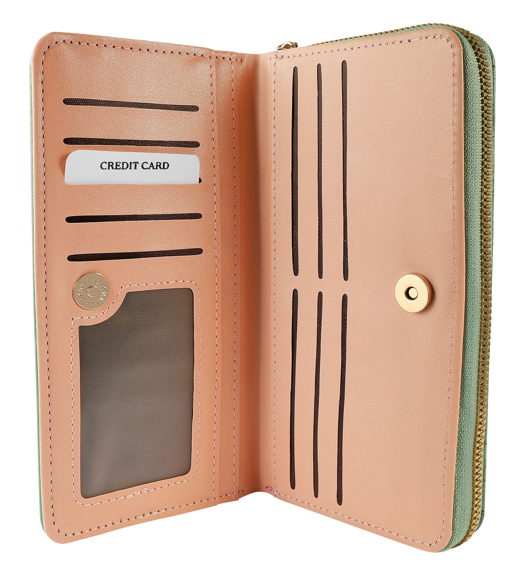 - Een extra vak, beveiligd met een drukknoop, onthult een slim interieur met tien creditcardvakjes, een transparant ID-vak en vier praktische insteekvakken.