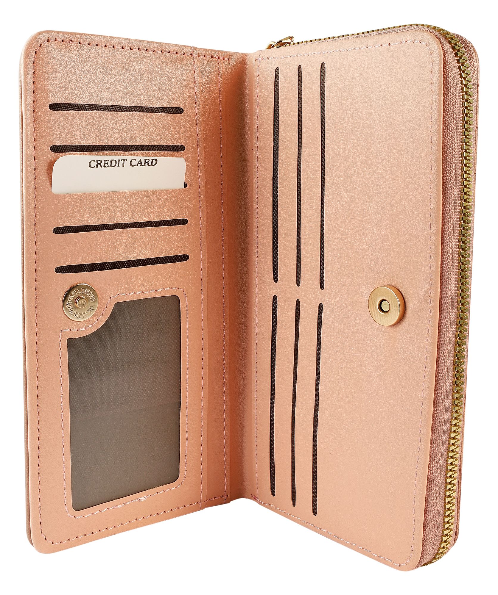 - Een extra vak, beveiligd met een drukknoop, onthult een slim interieur met tien creditcardvakjes, een transparant ID-vak en vier praktische insteekvakken.