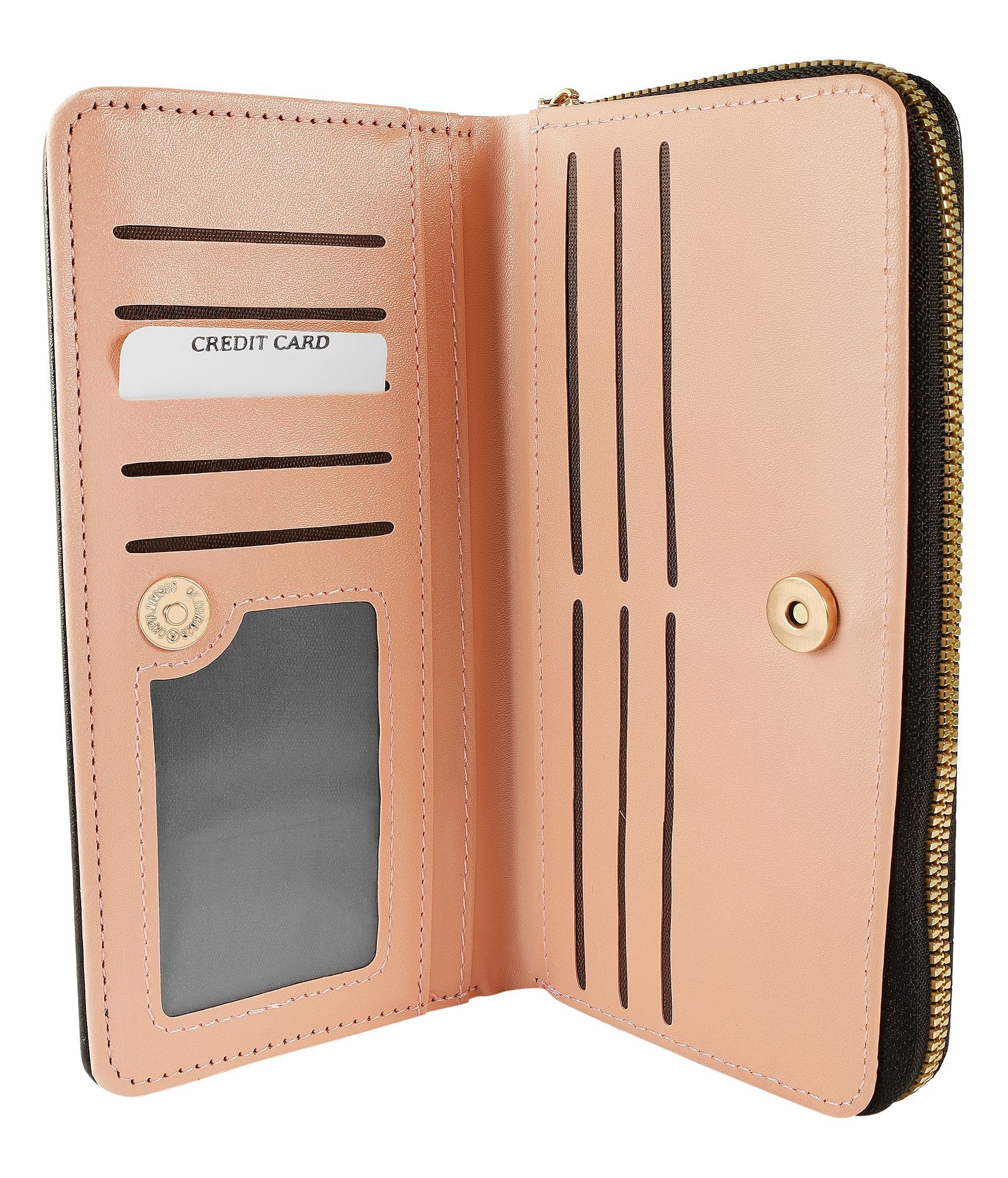 - Een extra vak, beveiligd met een drukknoop, onthult een slim interieur met tien creditcardvakjes, een transparant ID-vak en vier praktische insteekvakken.