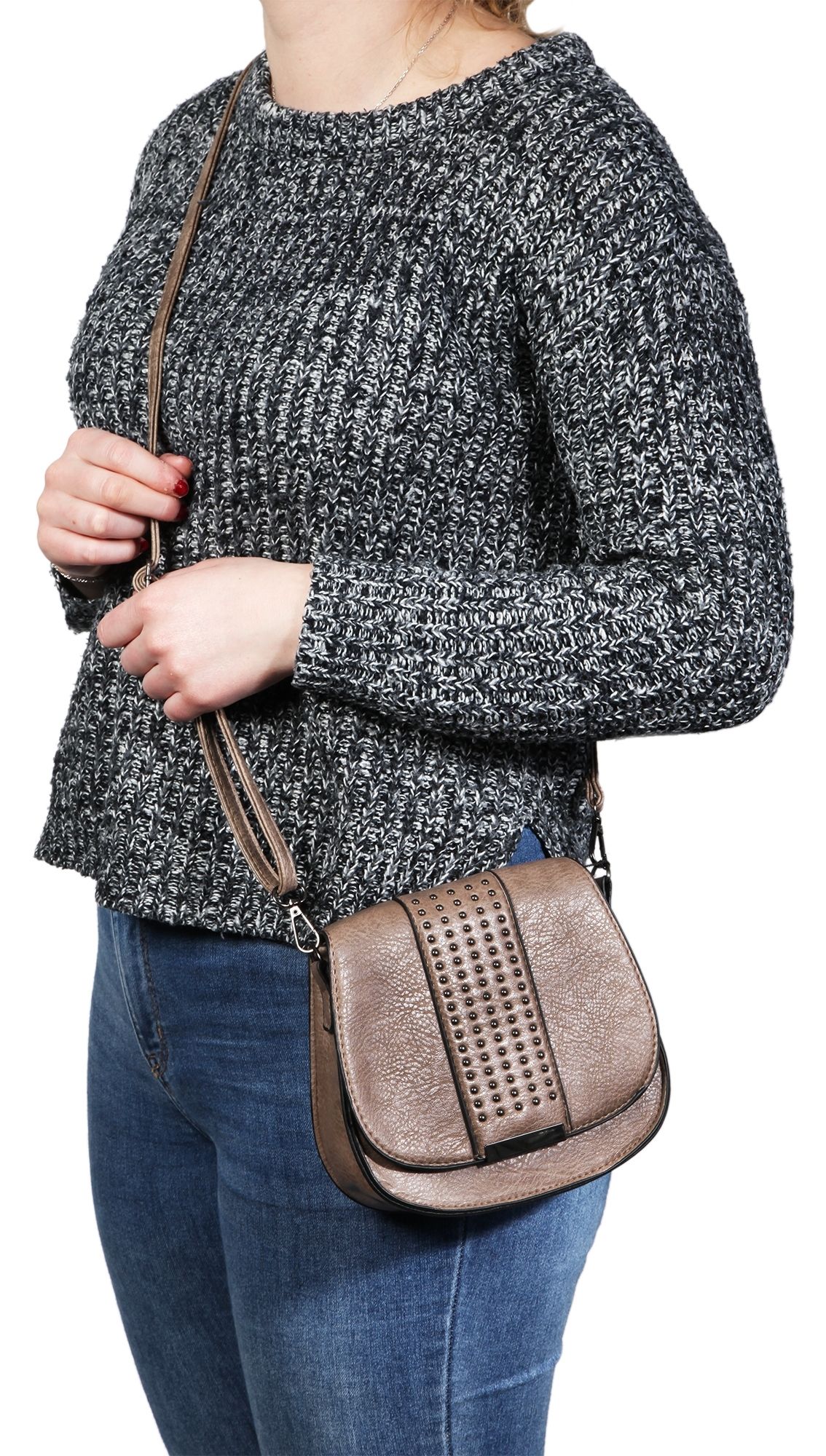 De moderne handtas is gemaakt van robuust kunstleer en heeft een licht gestructureerd oppervlak. De tas heeft ook een lang, afneembaar handvat dat kan worden verlengd tot een maximale lengte van ca. 140 cm. De schoudertas heeft een ruim binnenvak dat kan worden afgesloten met een ritssluiting en een klep met klinknagels en drukknoopsluiting. Deze stijlvolle tas is een modieuze allrounder die bij veel gelegenheden gedragen kan worden. Bovendien is niet alleen het ontwerp indrukwekkend, maar ook de mogelijkheid om al je belangrijke spullen in op te bergen. Of het nu gaat om een rustige wandeling, winkelen of een uitstapje - deze handtas is de ideale metgezel gemaakt van robuuste materialen. De ongevulde tas is 17,5 cm lang, 20,5 cm breed en 4 cm dik.