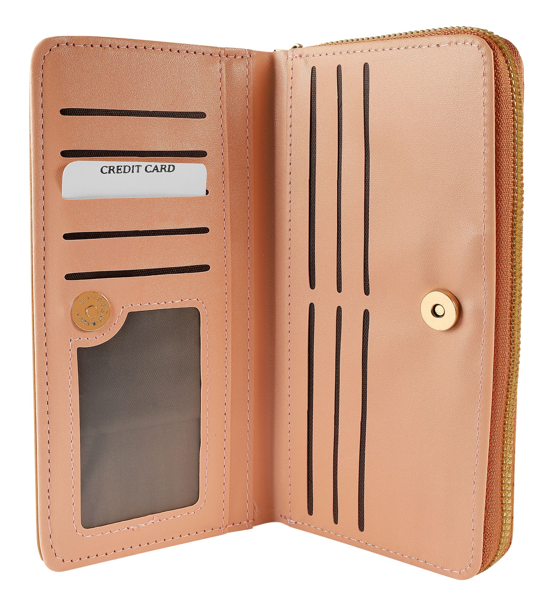 - Een extra vak, beveiligd met een drukknoop, onthult een slim interieur met tien creditcardvakjes, een transparant ID-vak en vier praktische insteekvakken.