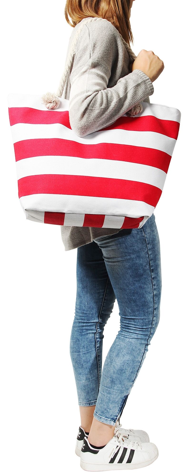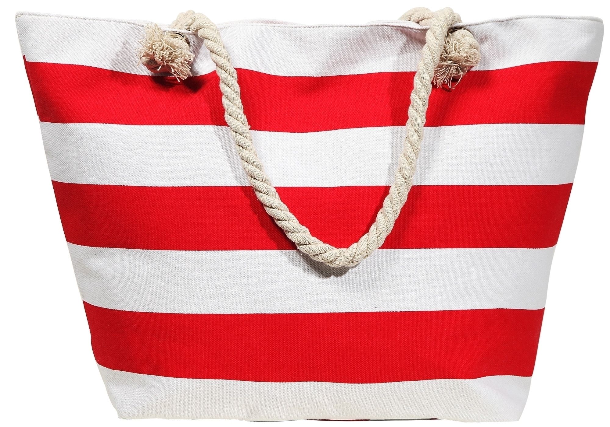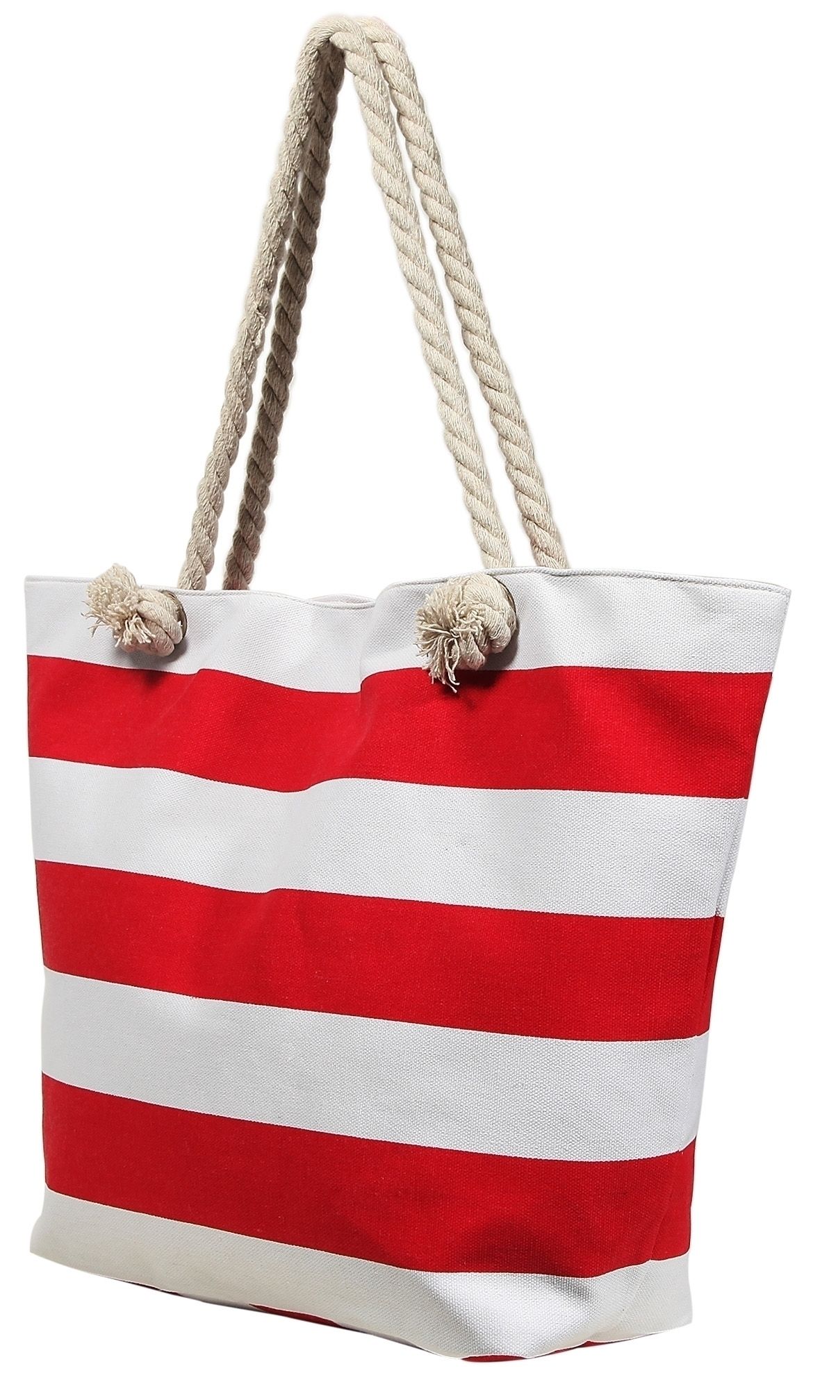 Productinformatie "Damestas/strandtas gestreept, wit/rood"