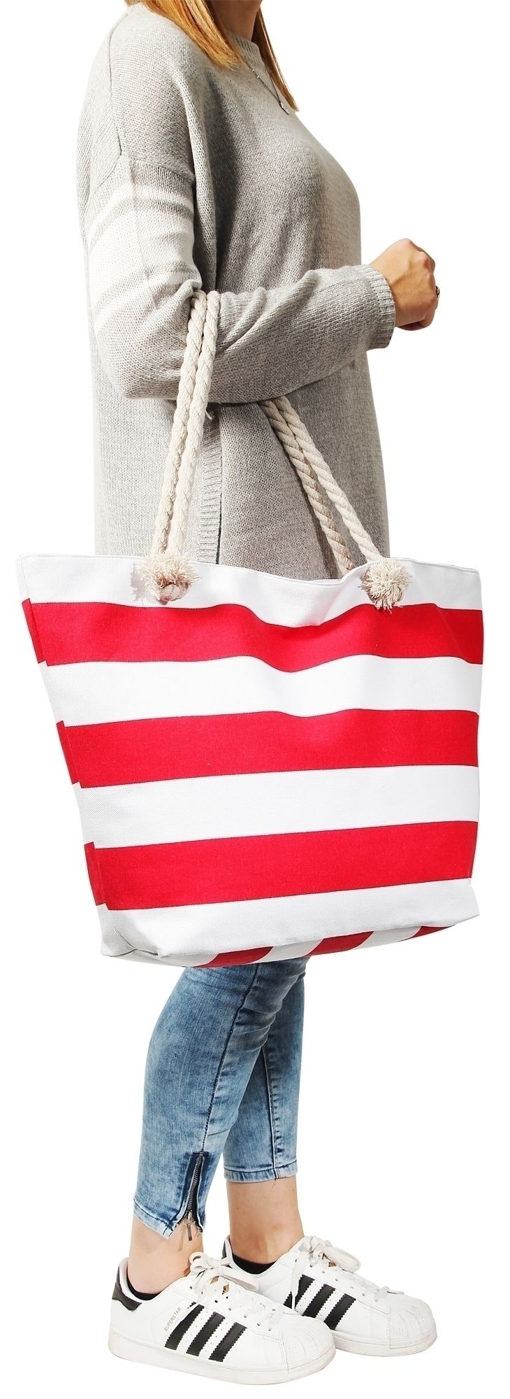 De kleurrijke handtas met trekkoordhengsels is gemaakt van textiel en is versierd met witte en rode strepen. De zomerse tas biedt ruime opbergruimte en binnenin zit een vakje voor je mobiele telefoon. Dankzij het materiaal en het ontwerp kan deze handtas ook heel goed als strandtas worden gedragen. De tas is 12 cm lang, 52 cm breed en 35 cm hoog.