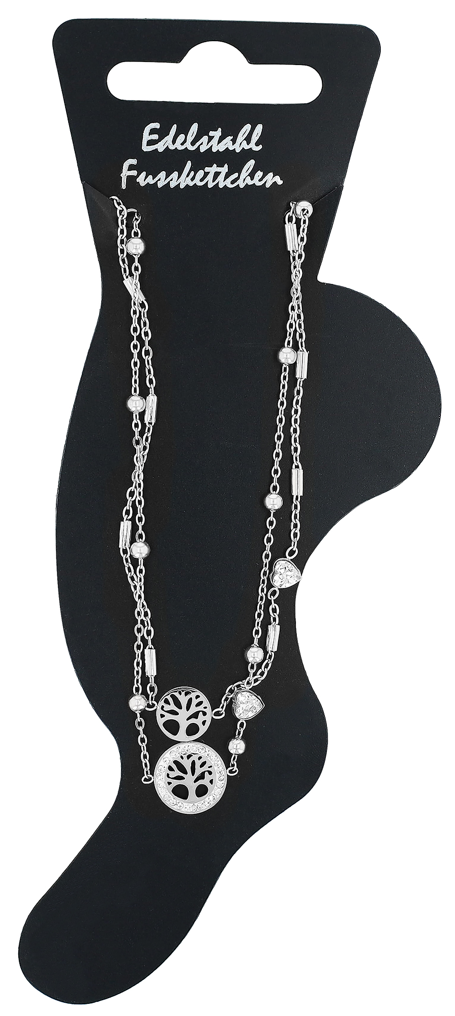 De enkelband van het merk Akzent is gemaakt van roestvrij staal en bestaat uit twee ankerkettingen van verschillende lengtes. De ene ketting is voorzien van gelijkmatig verdeelde kleine roestvrijstalen bolletjes en een levensboomhanger (Ø 12 mm) met een rand van fonkelend similé. Aan het uiteinde is ook een verlengkettinkje van 5 cm bevestigd, waarmee de lengte individueel kan worden gevarieerd en dus kan worden aangepast aan elke enkel. De andere ketting is versierd met kleine staafjes en een eenvoudige levensboomhanger (Ø 9 mm). Als highlight is in beide kettingen een glinsterend Simili hart verwerkt. De moderne enkelband kan worden geopend en gesloten met een karabijnsluiting, die ook van roestvrij staal is gemaakt. De afmetingen komen voort uit een lengte van 21 cm en een kettingdikte van 1 mm. Het moderne enkelbandsieraad maakt elke outfit compleet en is ook een geweldig cadeau.