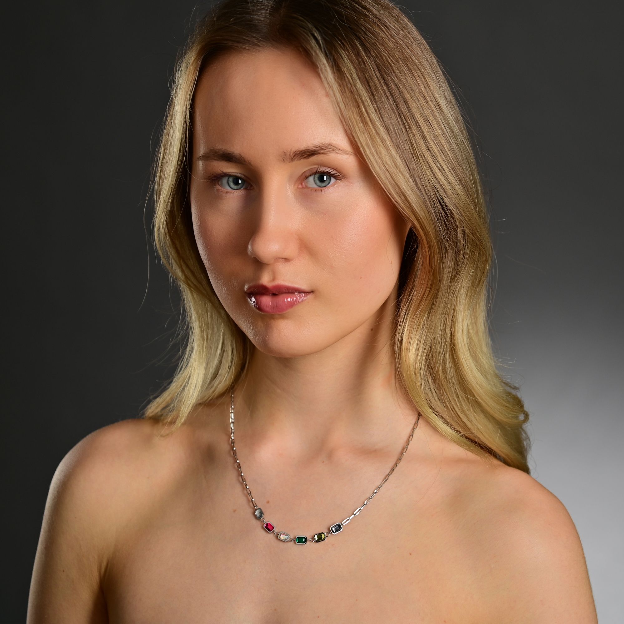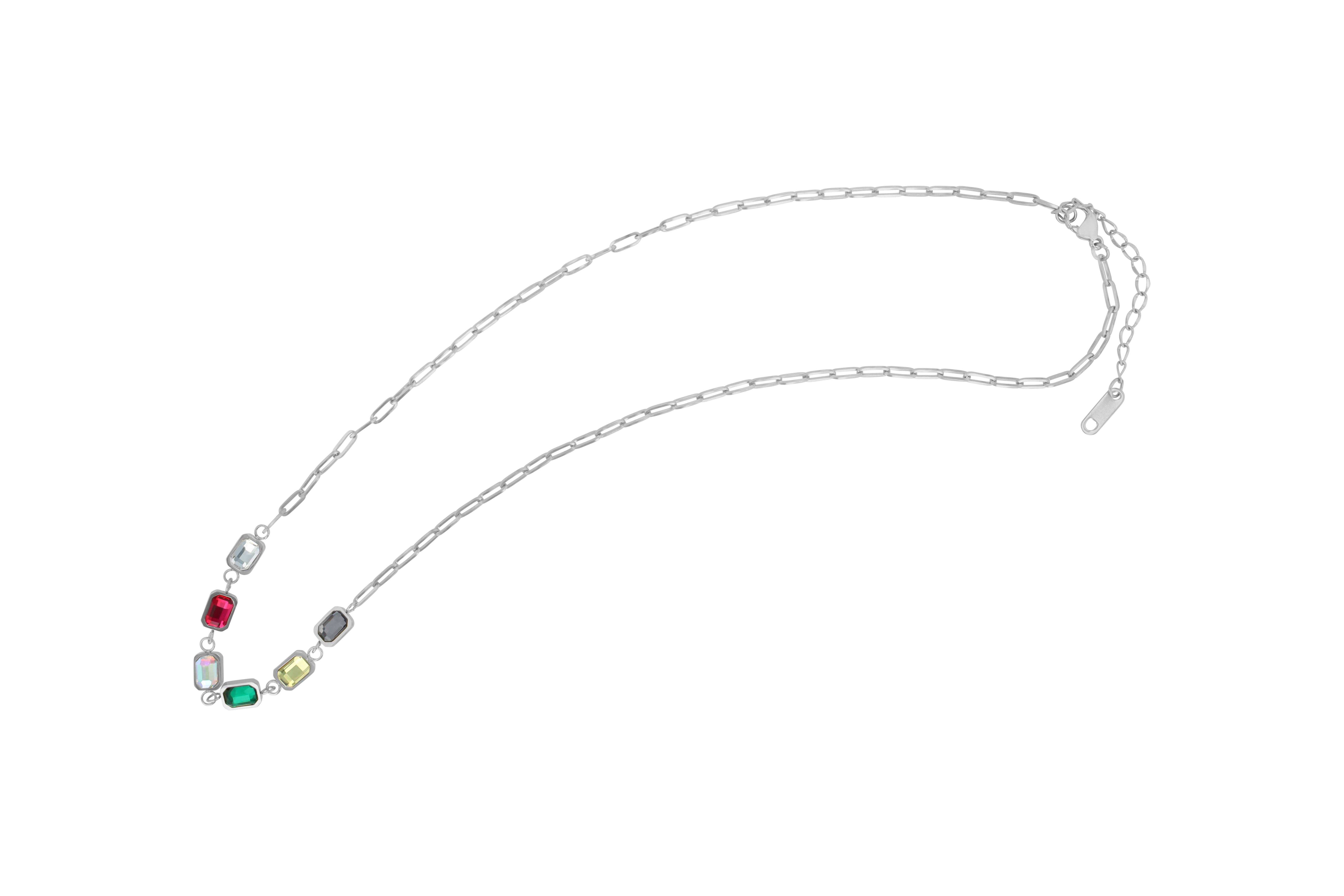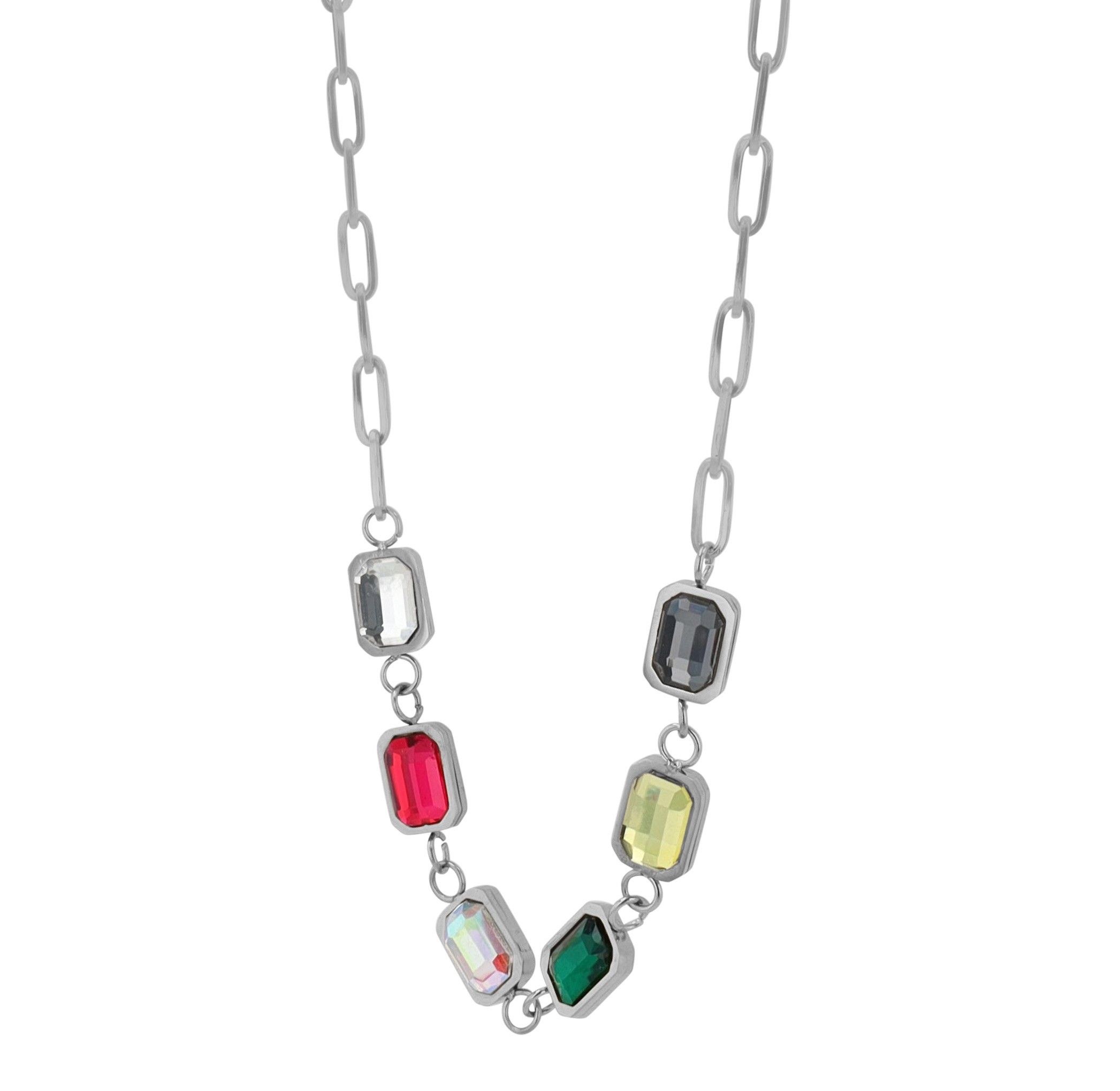 "Defne" roestvrij stalen collier met hanger, gekleurde zirkonia stenen, 44+5cm, zilverkleurig en goudkleurig 6 vaste hangers, elk van 7,5 x 5,5 mm, versierd met gekleurde zirkonia stenen