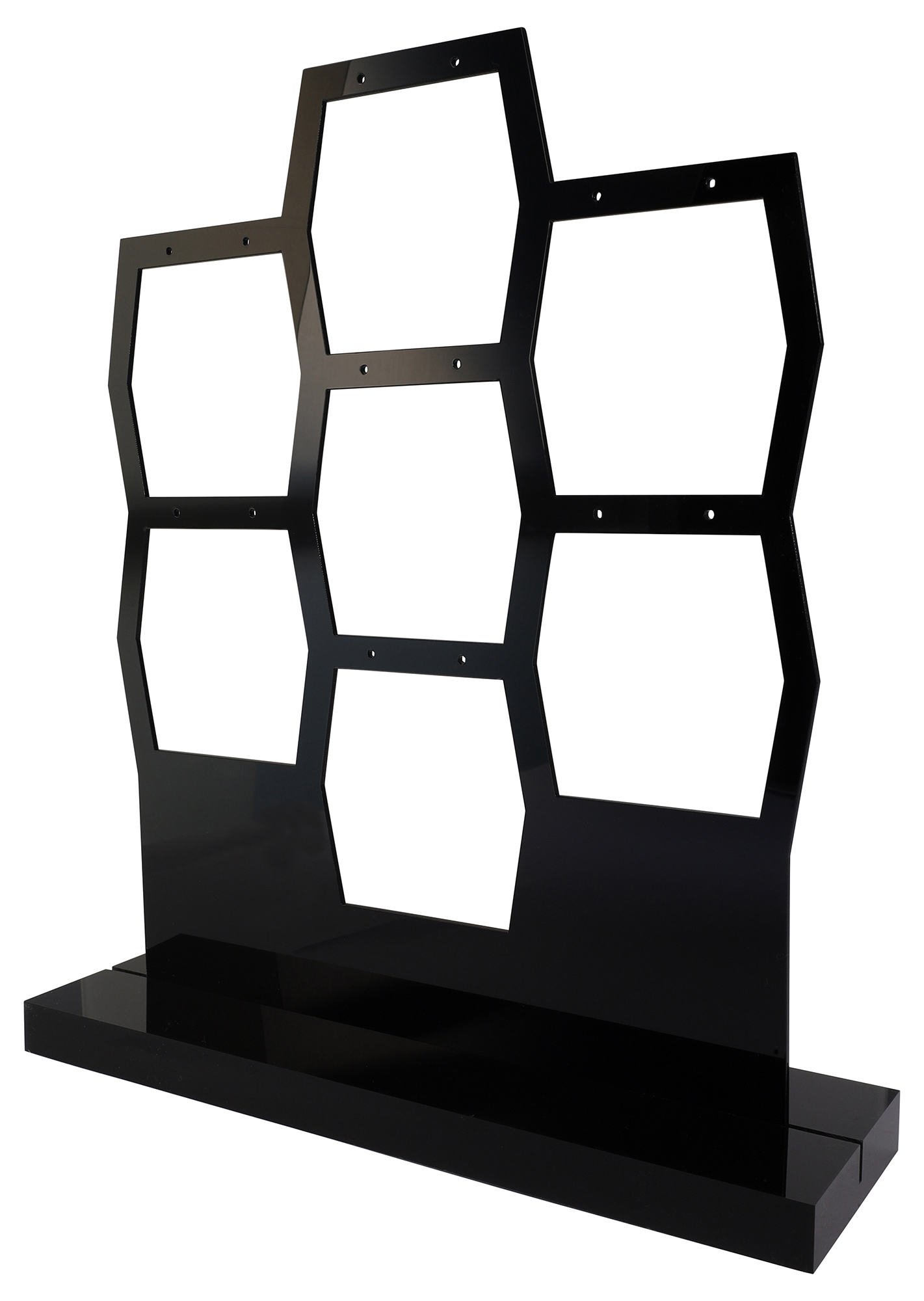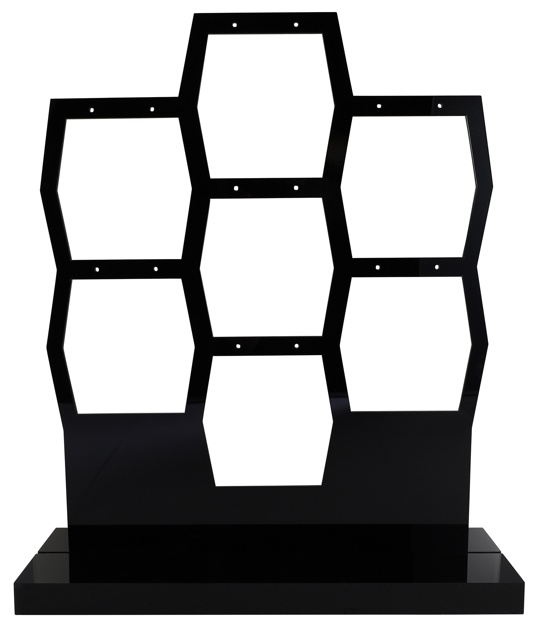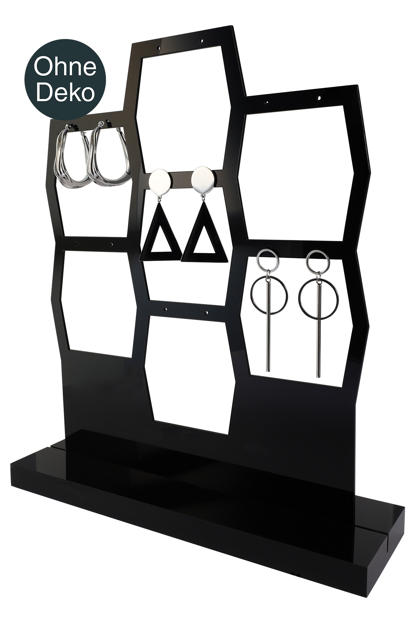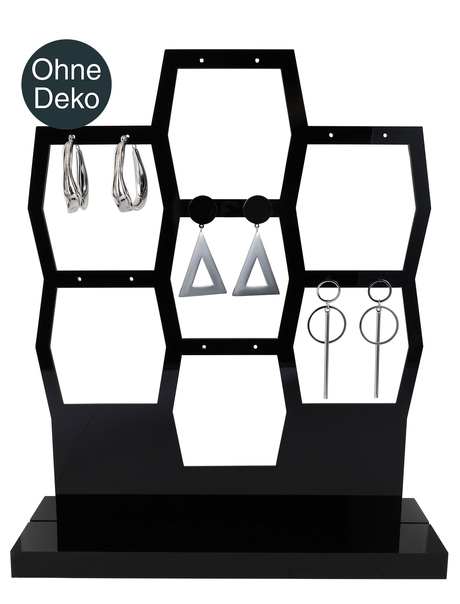 Kunststof sieradendisplay voor oorbellen in honingraat-look in zwart, (zonder decoratie). De display biedt ruimte voor 7 oorbellen. Afmetingen: 25 x 22 x 6