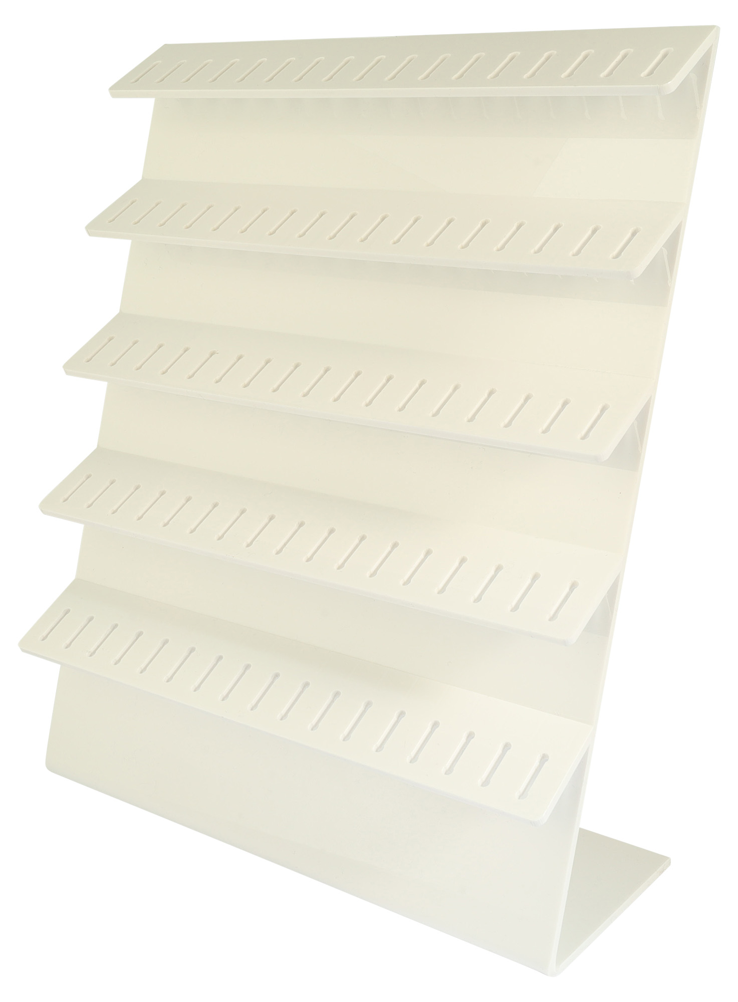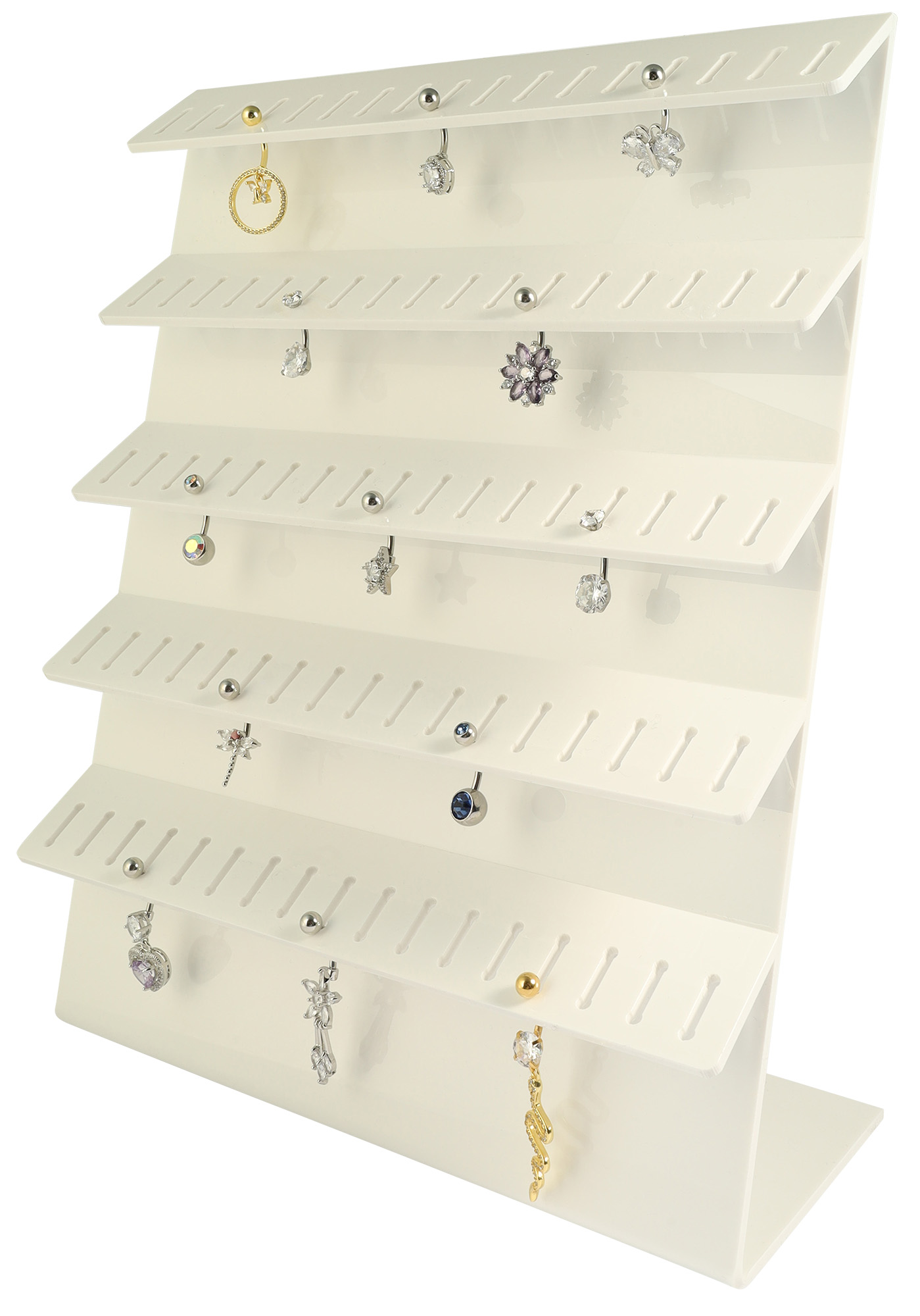 Deze eenvoudige display voor het presenteren van piercings heeft genoeg ruimte voor 85 piercings. Deze kunnen in 5 rijen, elk 4,2 cm van elkaar, op 17 aangewezen plaatsen worden geplaatst.