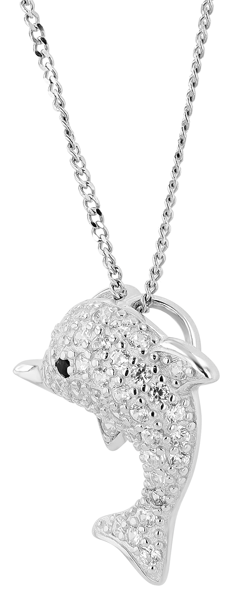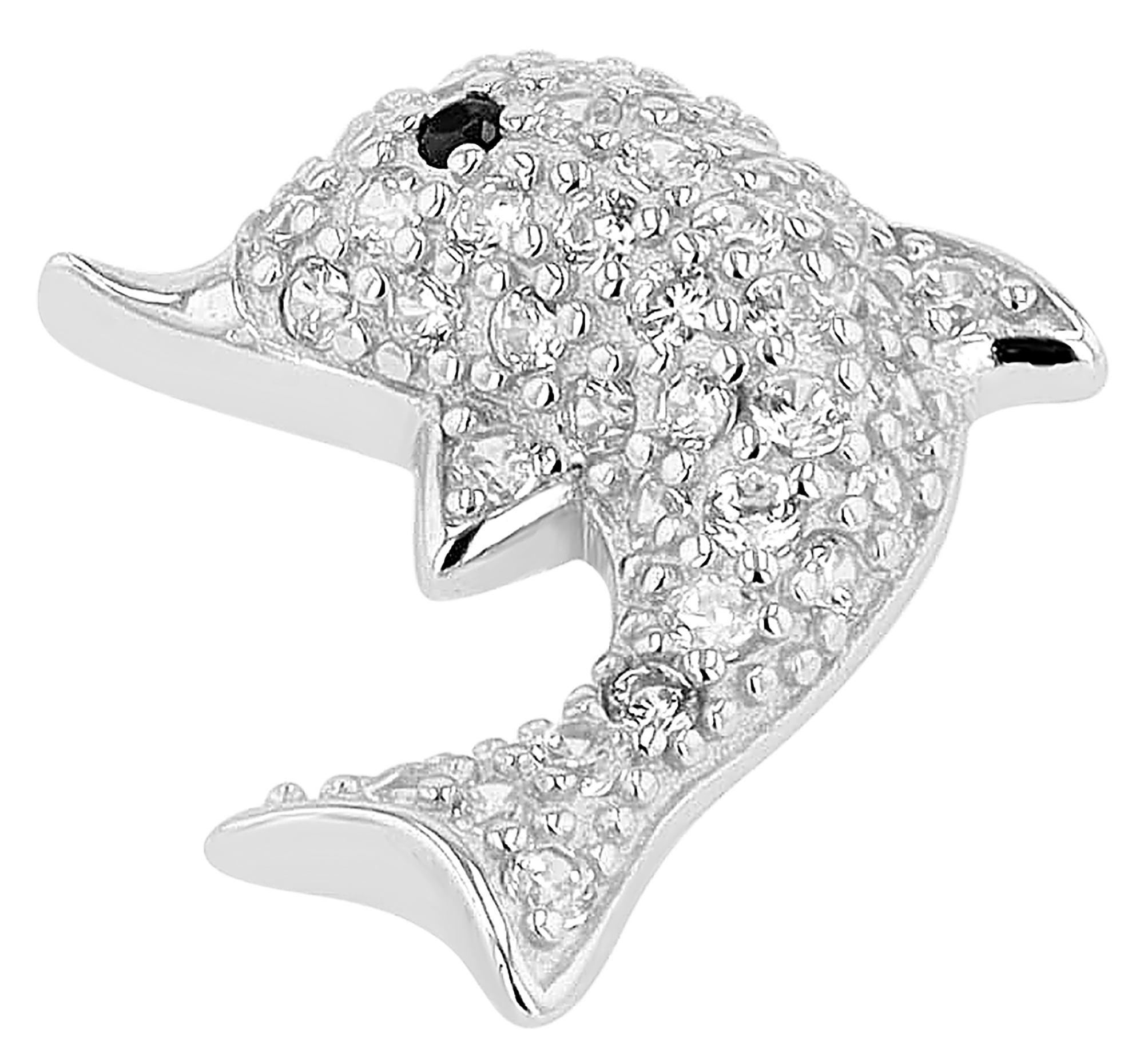 Met afmetingen van 19 x 11,5 x 5 mm en een verborgen oogsluiting lijkt het alsof de dolfijn gewichtloos aan de ketting zweeft. De vele zirkonia steentjes geven de hanger een glinsterend effect.