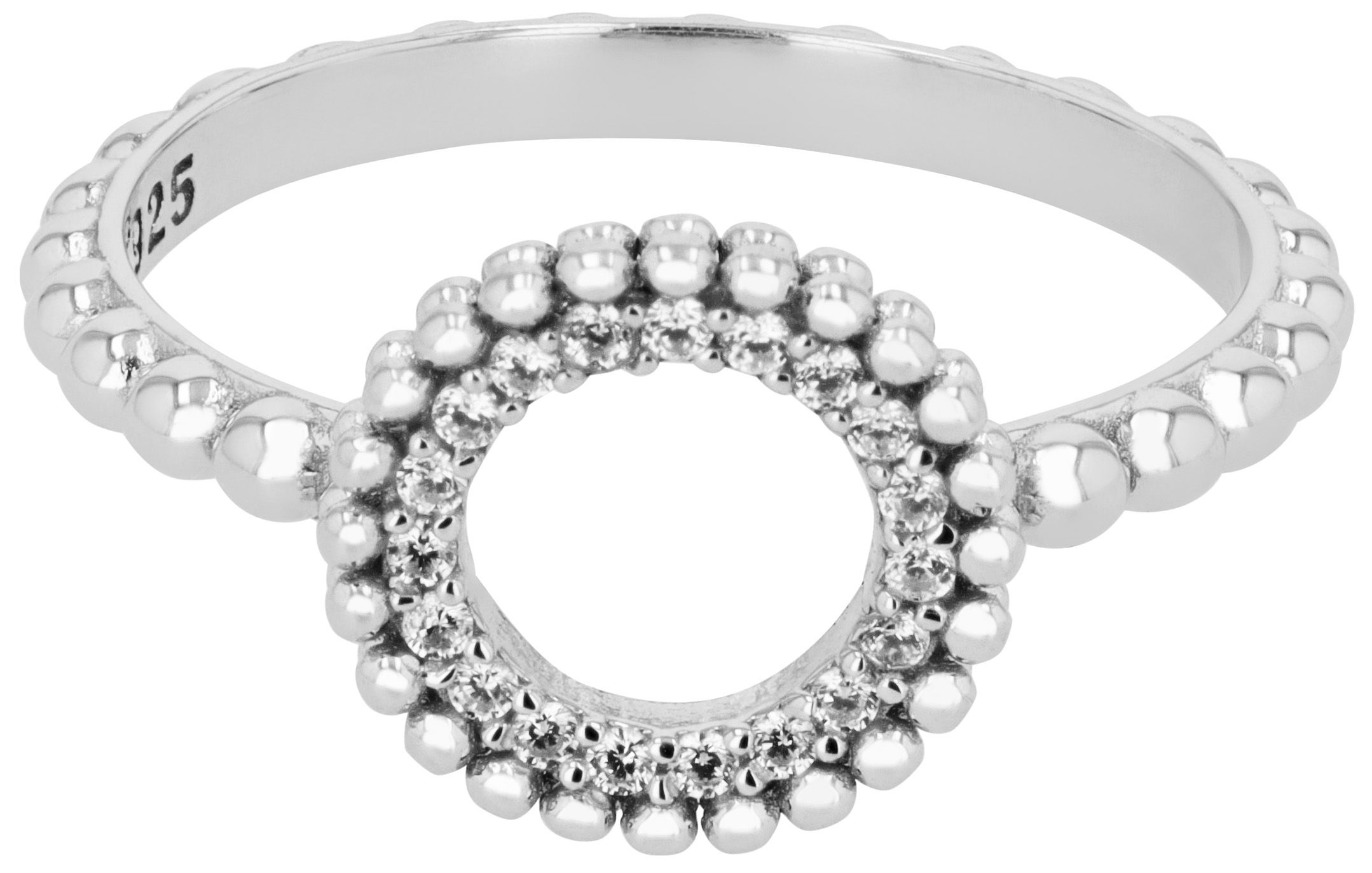 De ringband in een modieus stippendesign met een breedte van 2 mm geeft de ring een moderne en aantrekkelijke look. De ringkop, die een cirkelvormig silhouet vertoont met 19 zirkonia stenen die op hun beurt omlijst worden door het stippendesign, vormt een prachtig middelpunt van de ring.
