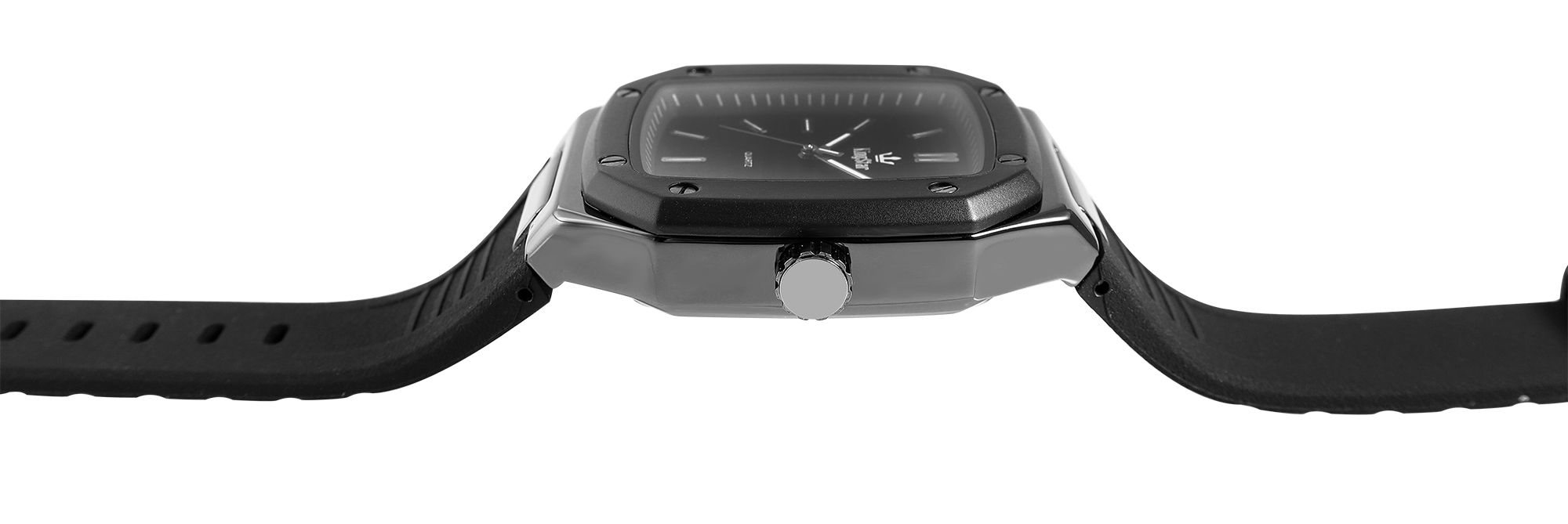 De rechthoekige kast van 44 x 51 mm is gemaakt van metaal en de kastdeksel is gemaakt van roestvrij staal. Ook dit horloge is uitgerust met een hoogwaardig quartz uurwerk. De totale lengte van het horloge is 27,5 cm en de siliconen band is 27 mm breed bij de stop.