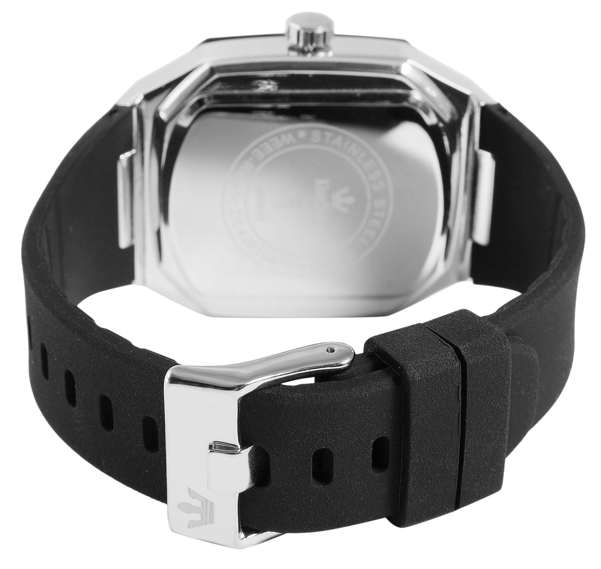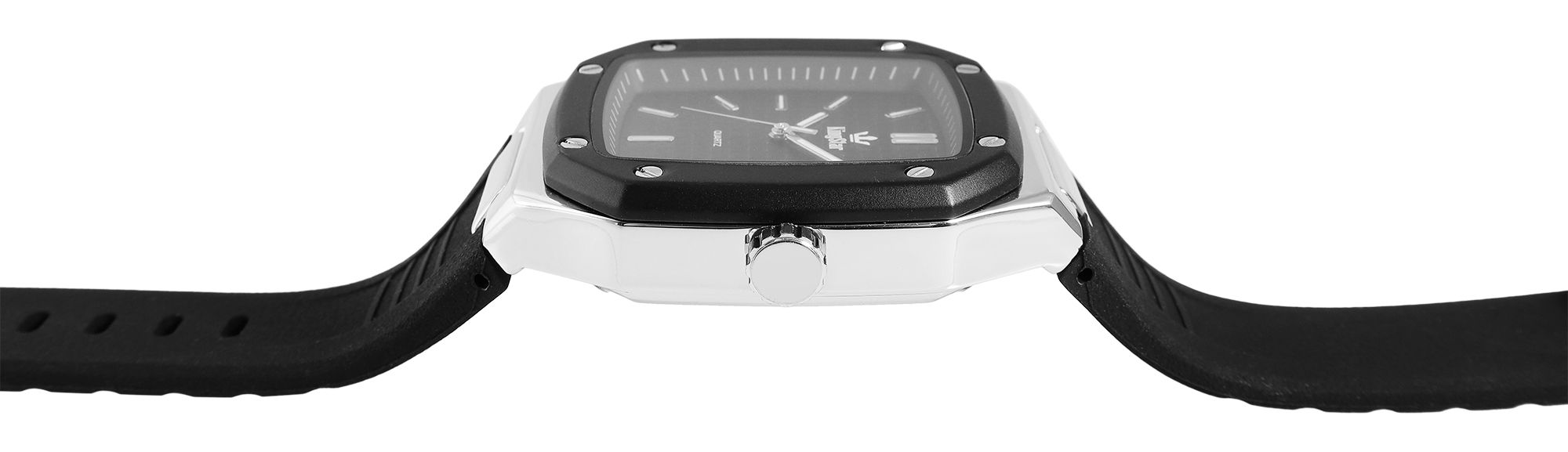 De rechthoekige kast van 44 x 51 mm is gemaakt van metaal en de kastdeksel is gemaakt van roestvrij staal. Ook dit horloge is uitgerust met een hoogwaardig quartz uurwerk. De totale lengte van het horloge is 27,5 cm en de siliconen band is 27 mm breed bij de stop.