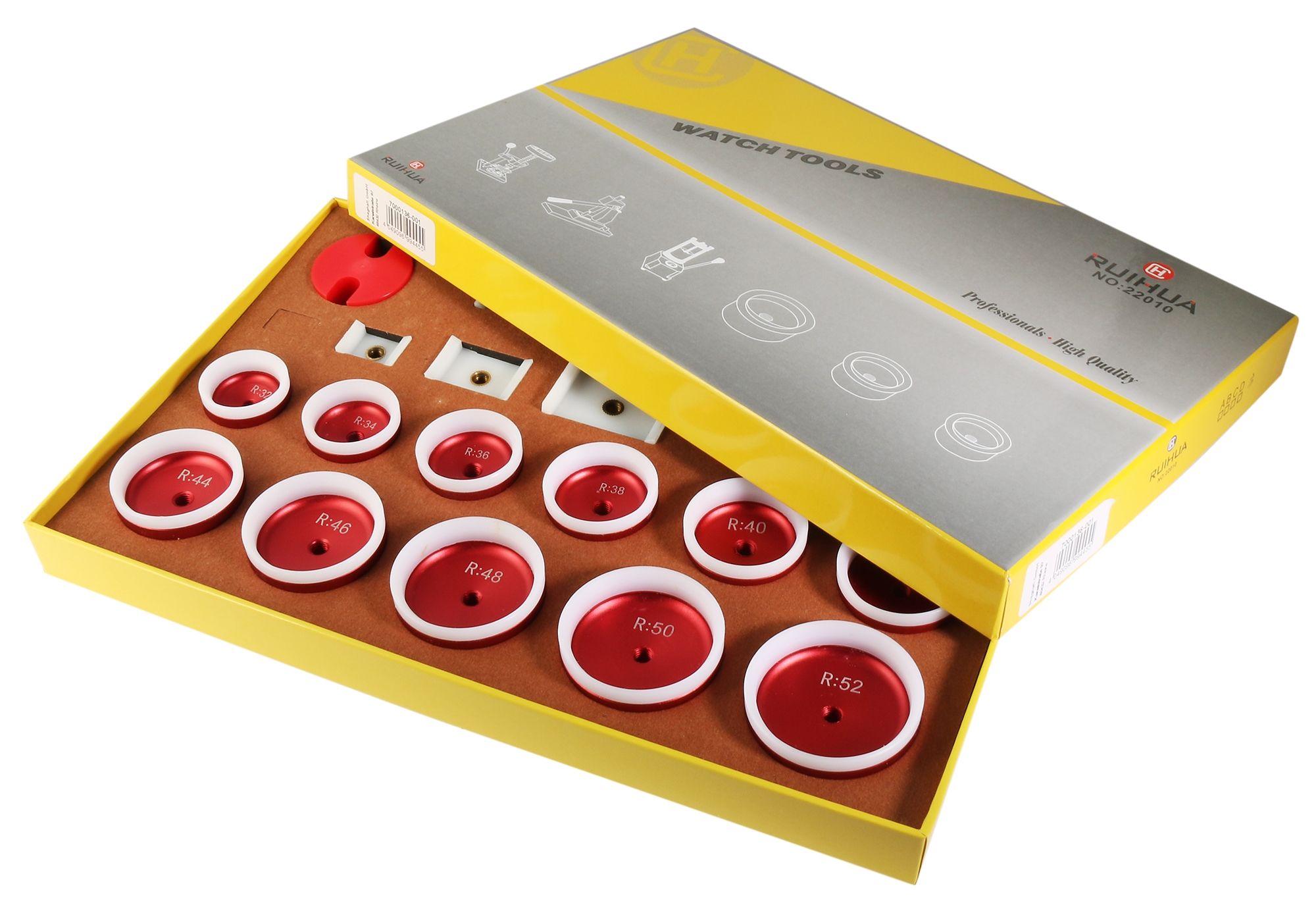 De onderdelenset bevat 20 drukstukken voor een glas-inpersblok of een behuizingsbodemsluiter. De set bevat 17 ronde drukstukken in de maten 20 mm - 52 mm, zes rechthoekige drukstukken in de maten 20 mm - 44 mm en een rond drukstuk met twee kleine ronde uitsparingen aan weerszijden voor horloges met een datumloep in de maat 40 mm.