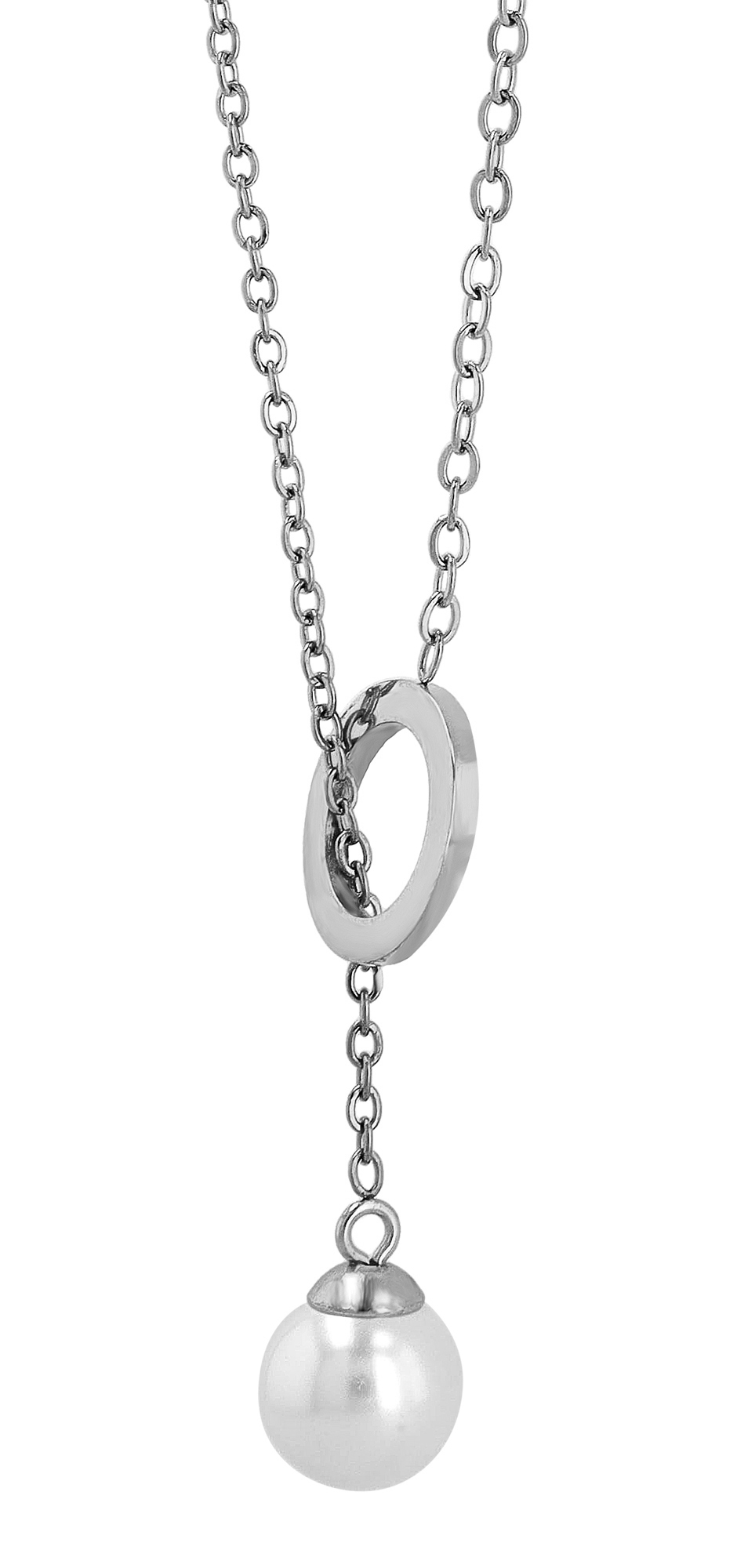 Deze betoverende halsketting voor dames combineert de koele elegantie en duurzaamheid van zilverkleurig roestvrij staal met de warme uitstraling van een witte parel (Ø 9 mm). Het fijne ringelement (8 mm binnendiameter, 2 mm dik) omlijst de parel op een sierlijke manier en benadrukt de elegantie van dit sieraad. Met een lengte van 45 cm is het de ideale metgezel voor elke dag en speciale momenten. De karabijnsluiting biedt een hoog draagcomfort in combinatie met een veilig sluitmechanisme.
