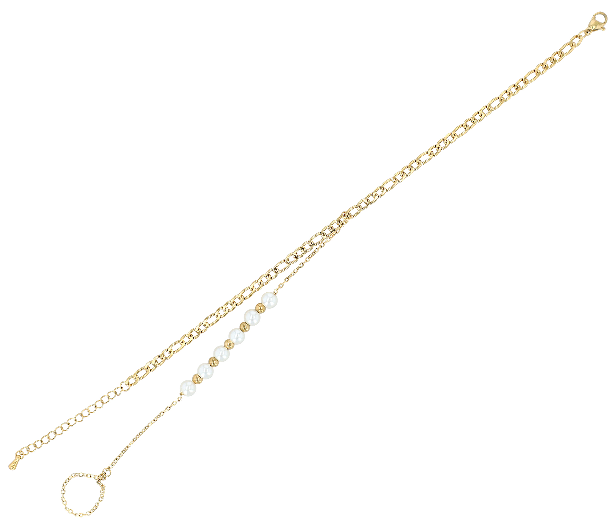 Zet stijlvolle accenten met deze prachtige enkelband van hoogwaardig, goudkleurig roestvrij staal. Het geraffineerde Figaro-krulkettinkje (4 mm) zorgt voor tijdloze elegantie, terwijl het delicate ankerkettinkje voor de teenring (1 mm) voor een bijzonder verfijnde look zorgt. Met een totale lengte van 21 cm en een extra verlenging van 5 cm biedt de enkelband een perfecte pasvorm. De teenring is verbonden met een 16 cm lange ankerketting, die is versierd met een 5 cm lange bies van zes glinsterende parels en vijf glanzende kerstballen. Dit elegante accessoire combineert zomerse lichtheid met moderne chic, perfect om een vleugje luxe toe te voegen aan het dagelijks leven.