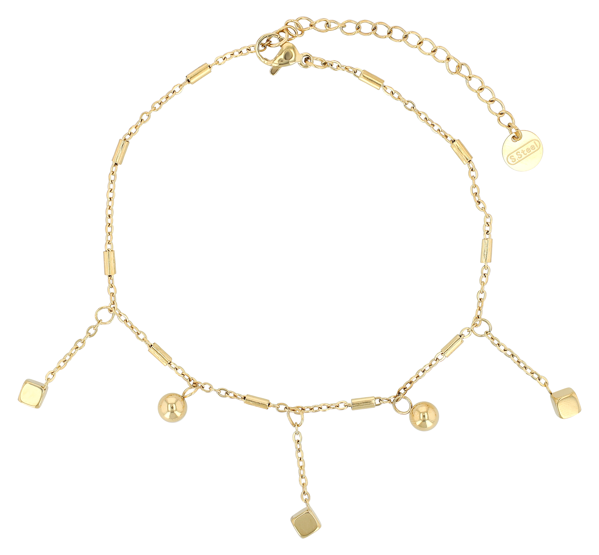 Gemaakt van hoogwaardig roestvrij staal en verkrijgbaar in de aantrekkelijke kleuren zilver en goud, is deze enkelband een must-have voor elke sieradencollectie. De praktische karabijnsluiting zorgt voor een goede pasvorm, terwijl de lengte van 21+5 cm en de fijne dikte van 1 mm een comfortabele pasvorm garanderen. Het hoogtepunt zijn de vijf hangers, waarvan er drie zijn bevestigd aan 2 cm lange kettingen en kleine staafjes met accenten op 1,5 cm afstand van elkaar.