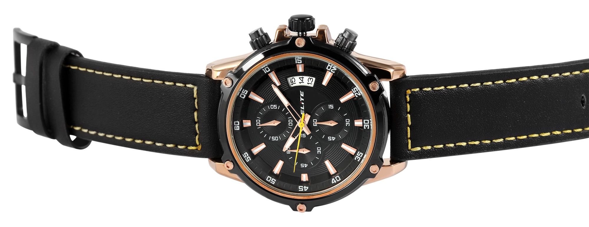 Productinformatie "ELITE herenchronograaf met echt lederen band, zwart/geel"