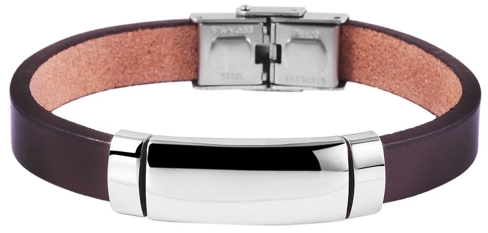 Deze veelzijdige unisex armband van het merk Akzent is een stijlvol accessoire dat indruk maakt door de combinatie van echt leer en roestvrij staal. De 1 cm brede leren band is in het midden versierd met een zilverkleurig graveerplaatje(29 x 13 mm) van roestvrij staal, dat ideaal is voor persoonlijke gravures.