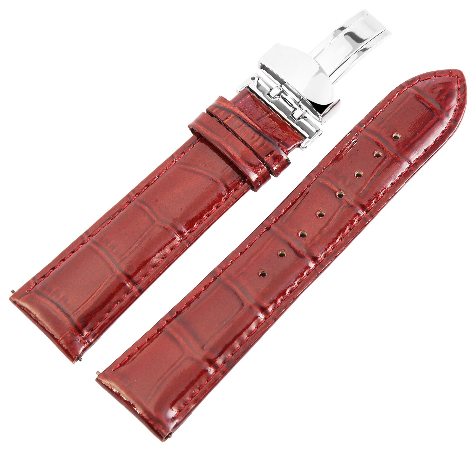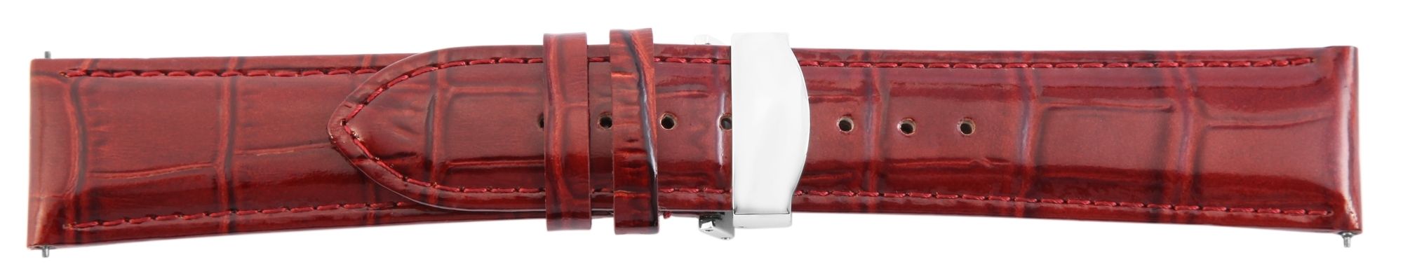 Klassieke vervangingsband van echt leer in de kleur bruin. De buitenste naad is in dezelfde kleur bruin. De riem is gewatteerd. Het is gemaakt van rundleer en heeft een alligatorleren ontwerp in reliëf. De riem heeft een brugbreedte van 26 mm, een zilverkleurige vlindersluiting en twee riemlussen. Het gaatjesgedeelte loopt taps toe tot een punt aan het einde.