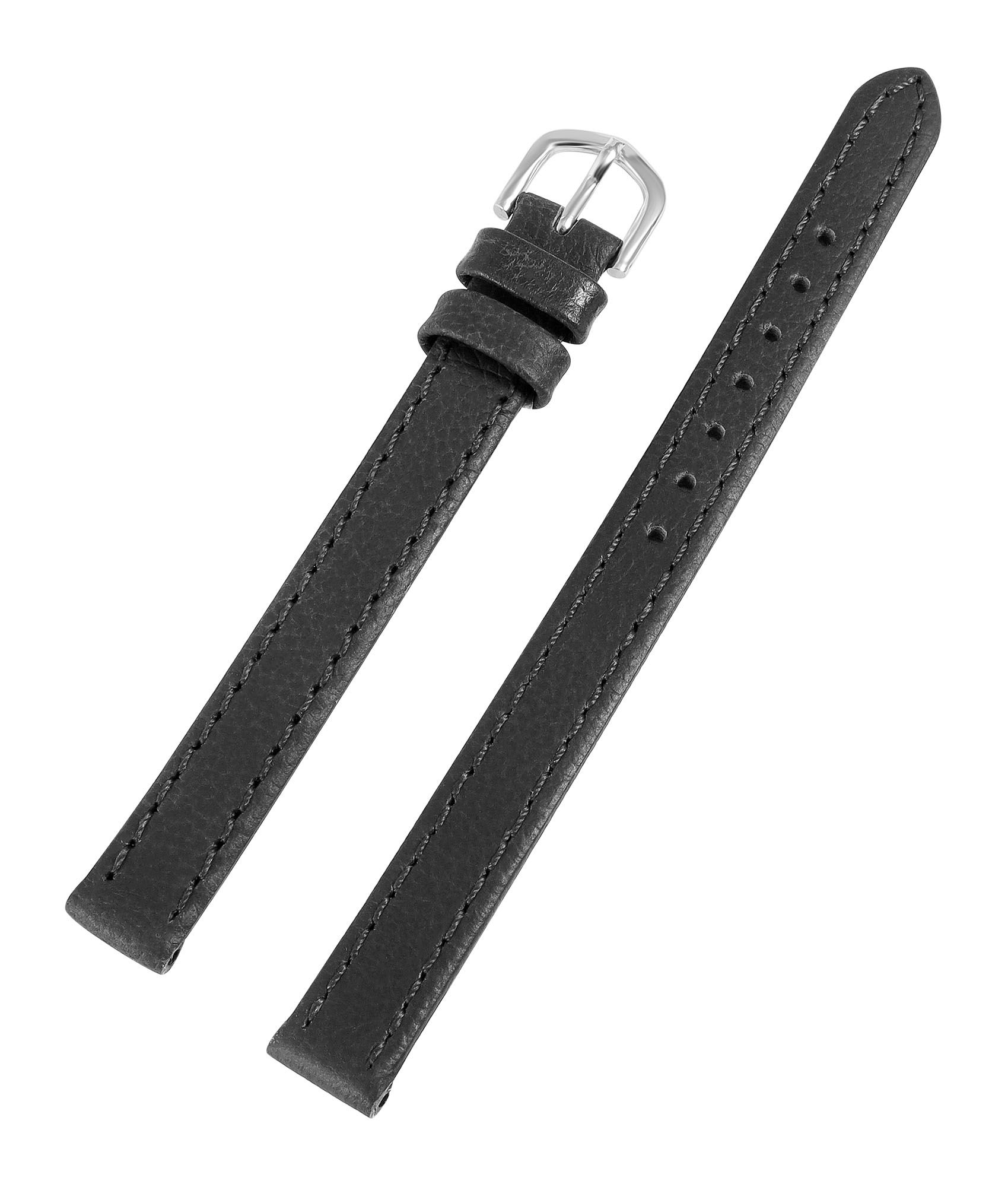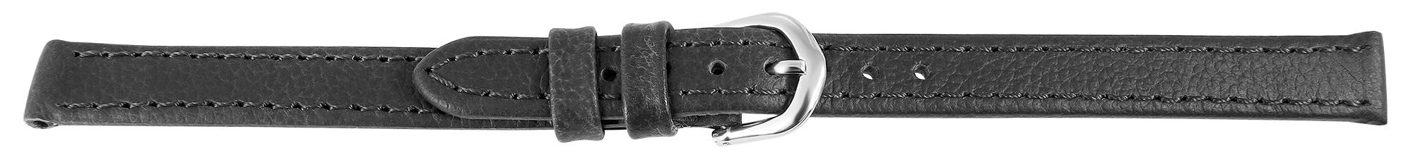 Echt leren horlogeband "superzacht", donkergrijs, gestikt, 14 mm Het is gemaakt van robuust echt leer in superzachte kwaliteit voor een hoog draagcomfort en is voorzien van een elegante zilverkleurige gesp voor een stevige pasvorm. De eerste lus is gestikt, wat voor extra stabiliteit zorgt. De band loopt taps toe, waarbij de lug van de sluiting 2 mm kleiner is dan de lug van de band. De band is afgewerkt met een discrete naad rondom die het ontwerp een traditionele en sportief-elegante touch geeft.