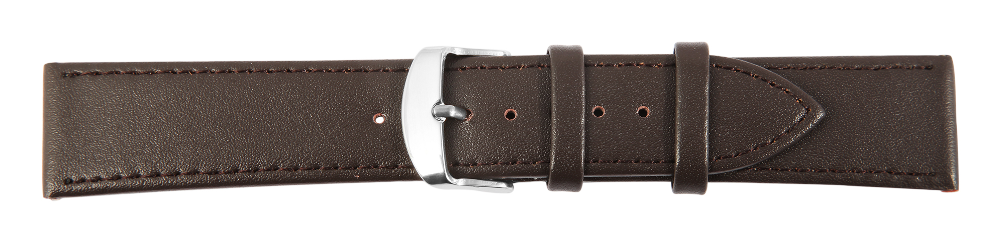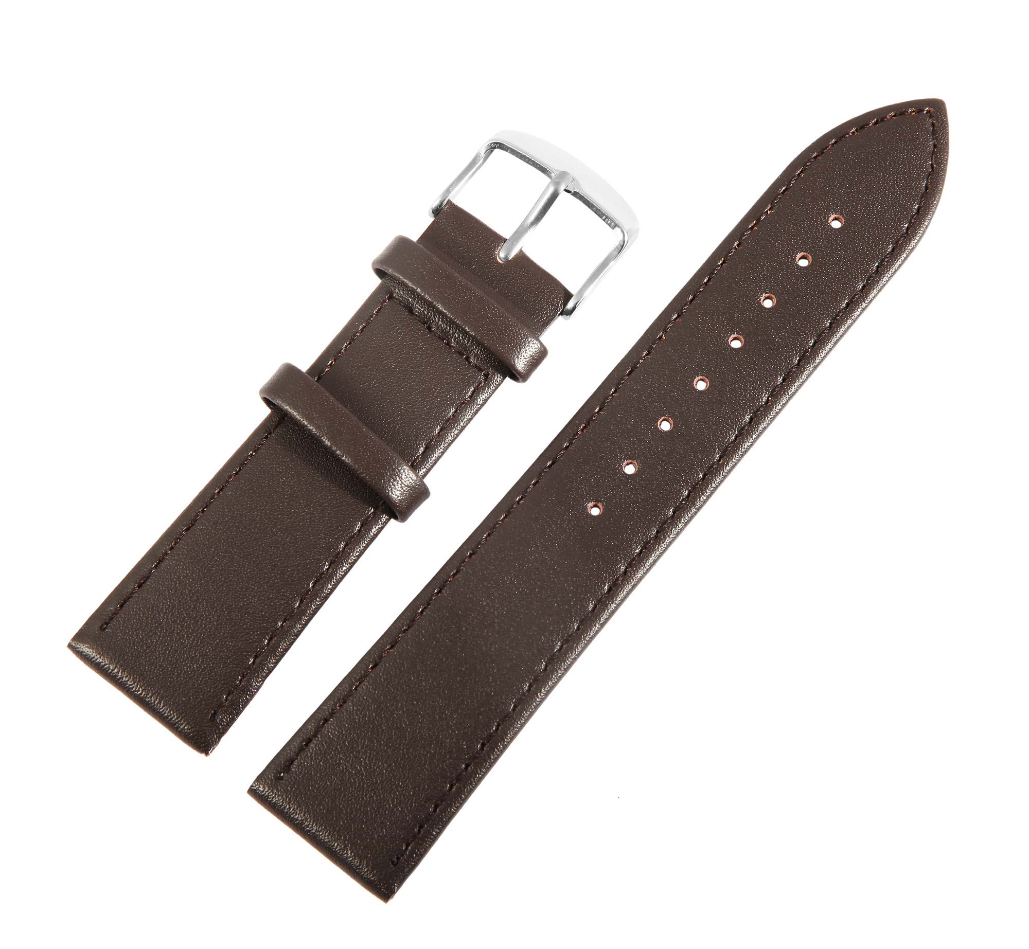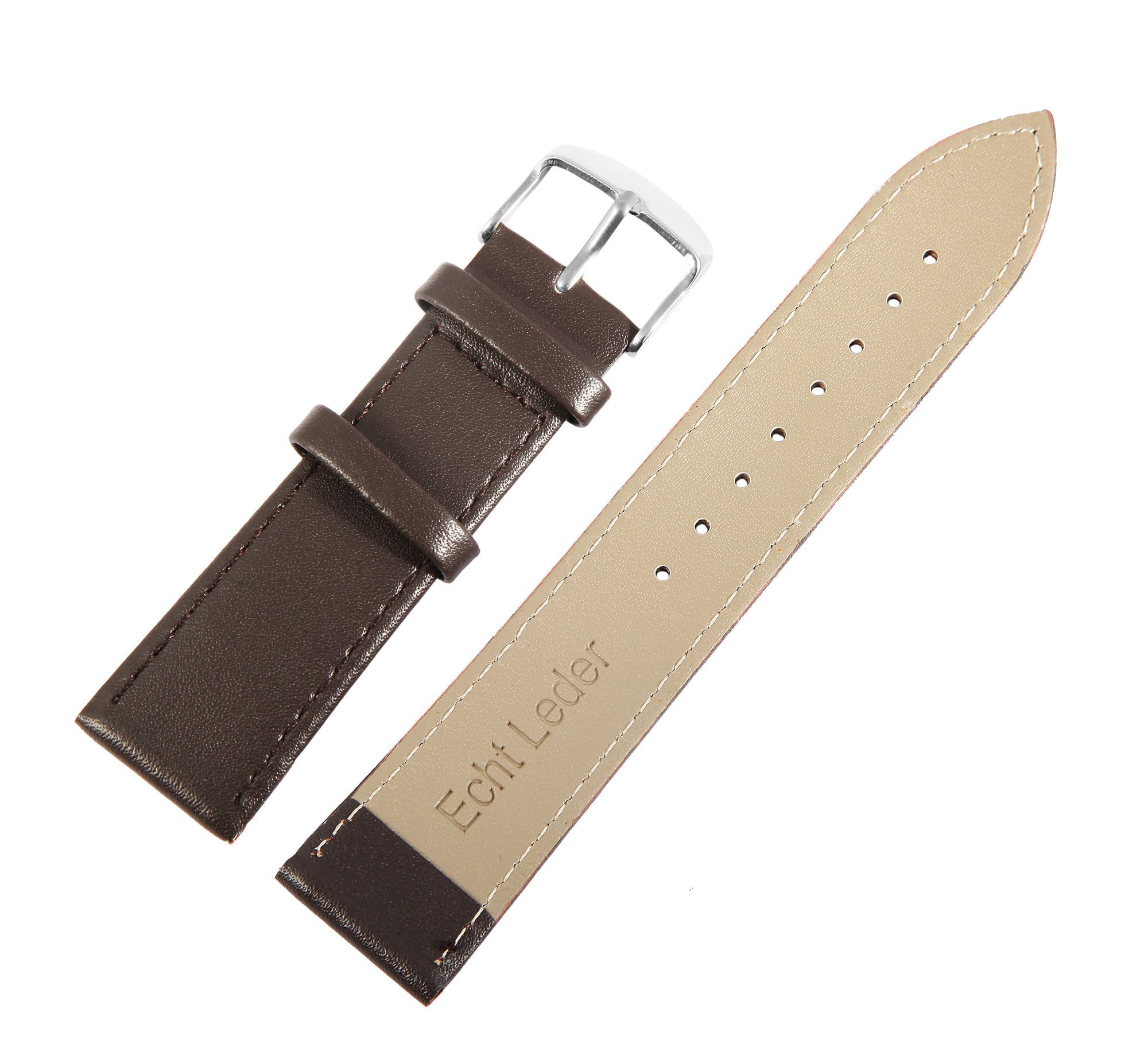 De bruine horlogeband van echt leer heeft een lugbreedte van 16 mm. Het heeft een glad oppervlak en is afgezet met een fijne bruine naad. De materiaaldikte is 3 mm. Het horlogebandje heeft een totale lengte van 21,5 cm. De sluiting is 2 mm smaller dan de breedte van de lug, omdat het bandje smal is. Het kan worden geopend en gesloten met een zilverkleurige gesp.