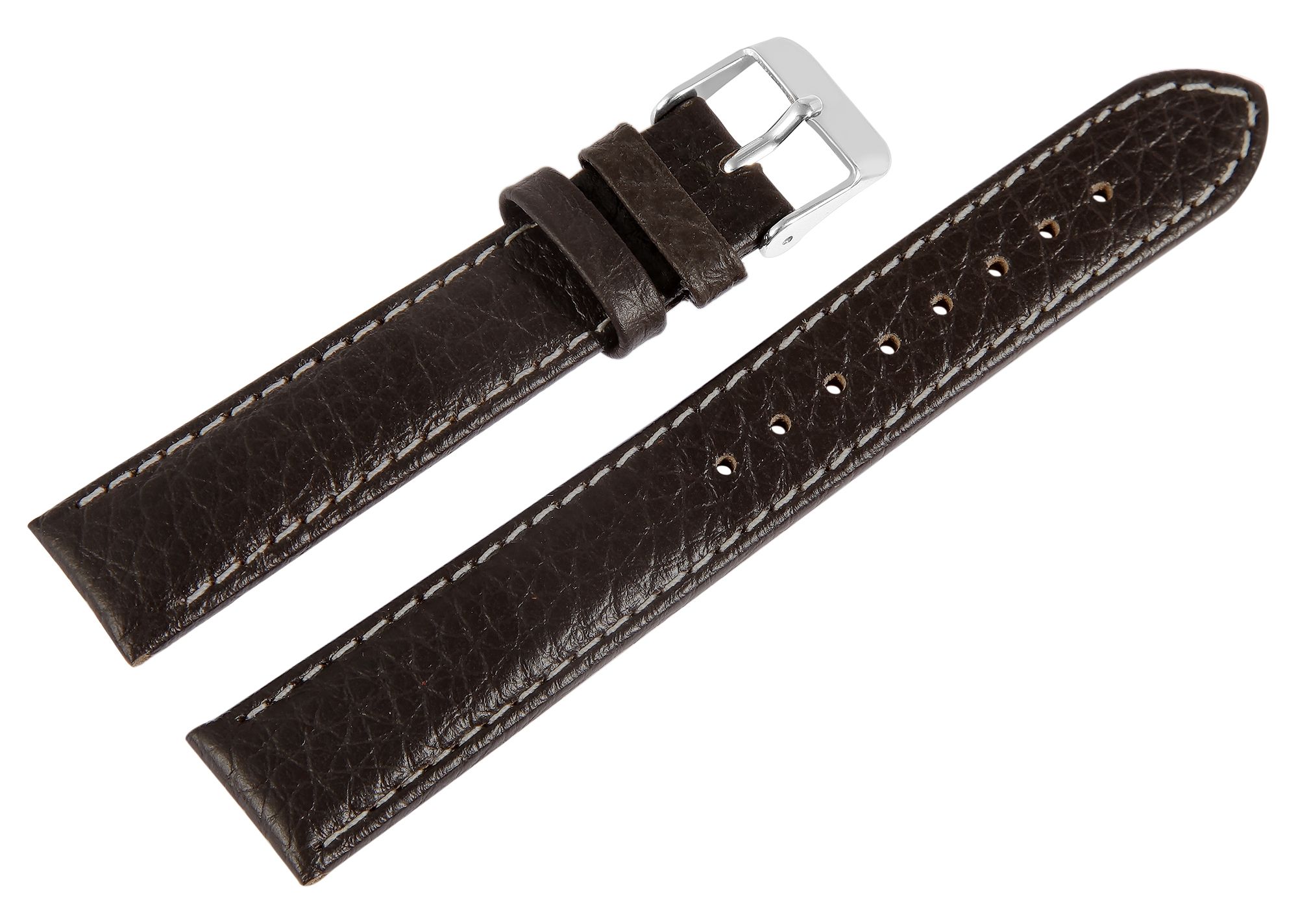 De donkerbruine horlogeband is gemaakt van echt leer en heeft een breedte van 24 mm. De totale lengte van het horlogebandje is 21,5 cm en de materiaaldikte is 4 mm. De sluiting is 2 mm smaller dan de breedte van de lug, omdat het horlogebandje daar smaller is. Het vervangbandje kan worden geopend en gesloten met een zilverkleurige, hoogglans gepolijste gesp. De witte stiksels zorgen voor een goede duurzaamheid en stabiliteit. De glanzende afwerking in combinatie met het licht generfde leren bandje benadrukt het mooie design van het horlogebandje en maakt het snel en gemakkelijk om om te doen en af te doen.