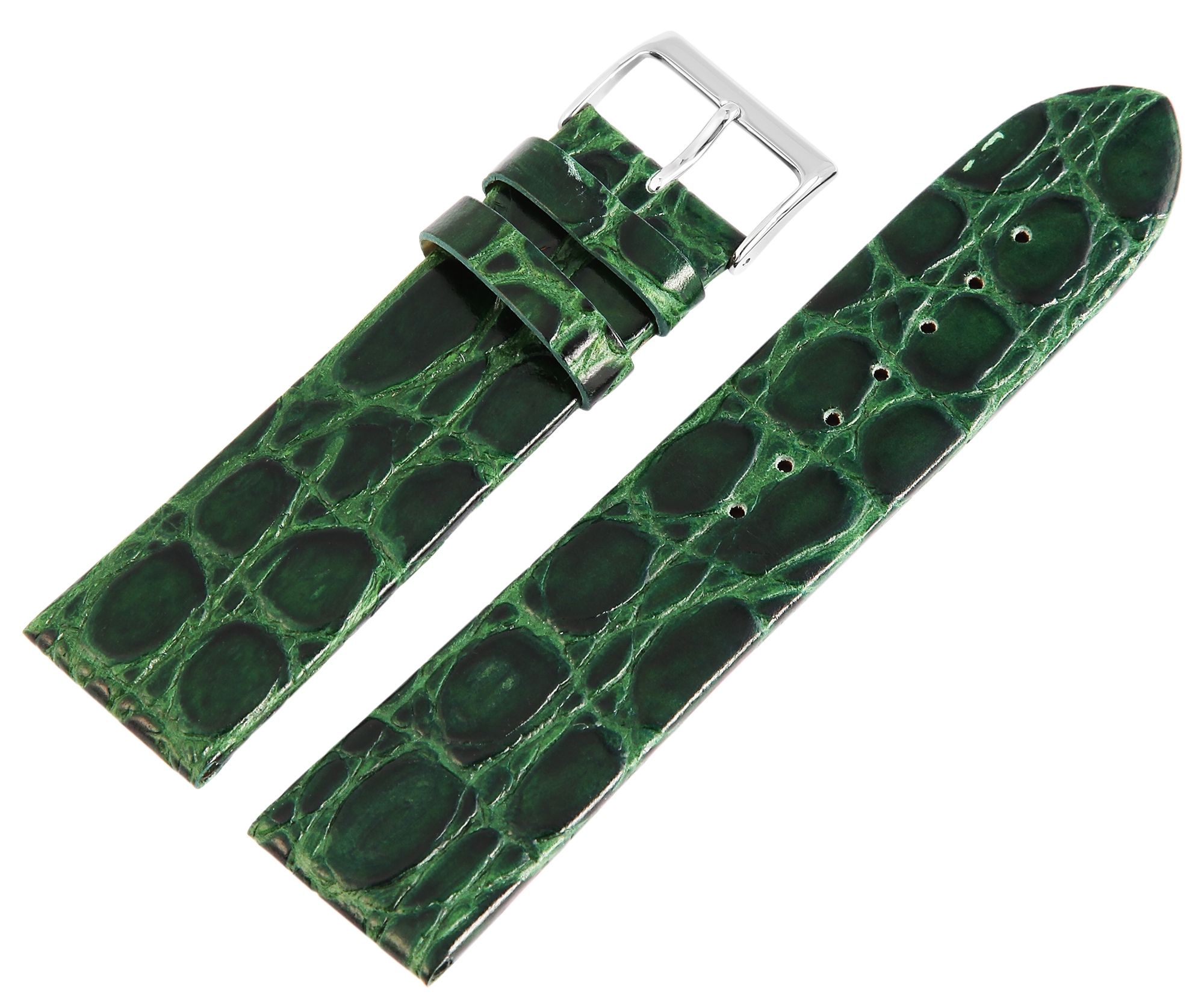 Klassieke vervangingsriem van echt leer in de kleur groen. Het staafgewricht is aan beide zijden gewatteerd. Het is gemaakt van rundleer en heeft een alligatorleren ontwerp in reliëf. De riem heeft een brugbreedte van 26 mm, een zilverkleurige gesp en twee riemlussen. Het gaatjesgedeelte loopt taps toe tot een punt aan het einde.