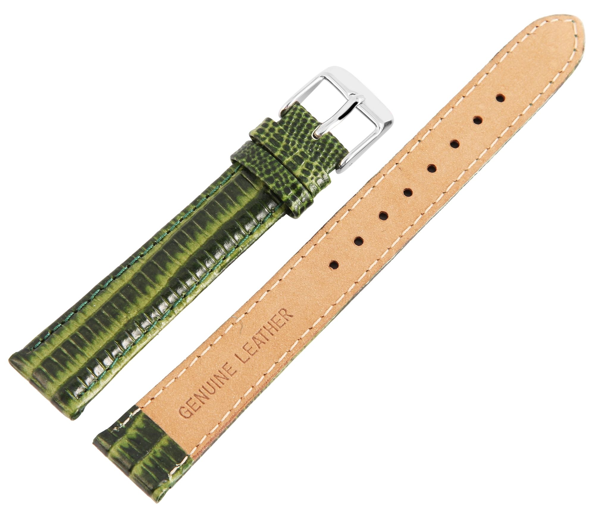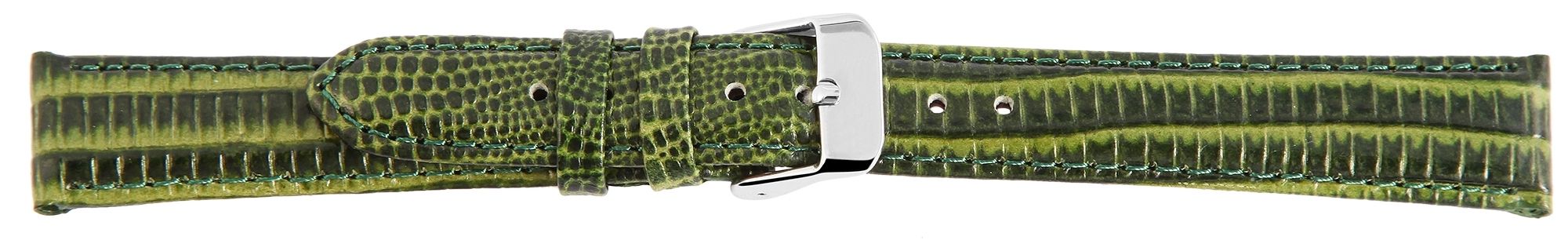 Vervangingsriem van echt leer in de kleur groen. De hele riem is gewatteerd. Het is gemaakt van rundleer met een reliëf van hagedisleer. De riem heeft een brugbreedte van 16 mm, een zilverkleurige gesp en twee riemlussen. Het gaatjesgedeelte loopt taps toe tot een punt aan het einde.