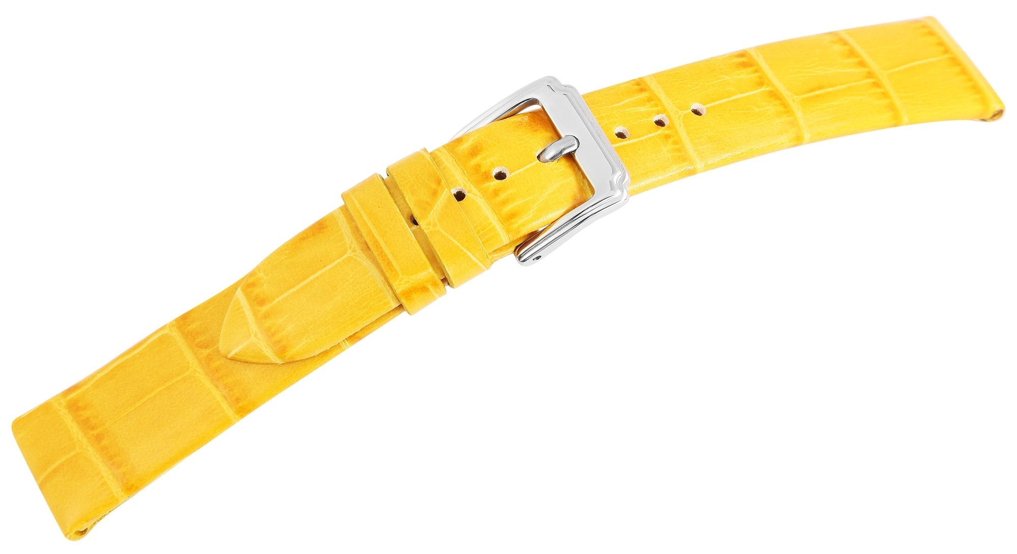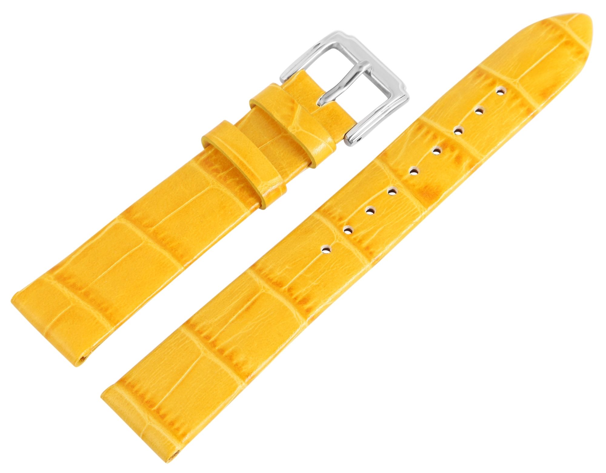 Klassieke vervangingsband van echt leer in de kleur geel. Het is gemaakt van het fijnste rundleer en heeft een alligatorleren ontwerp in reliëf. De riem heeft een brugbreedte van 16 mm, een zilverkleurige gesp en twee riemlussen. Het gaatjesgedeelte loopt taps toe tot een punt aan het einde.