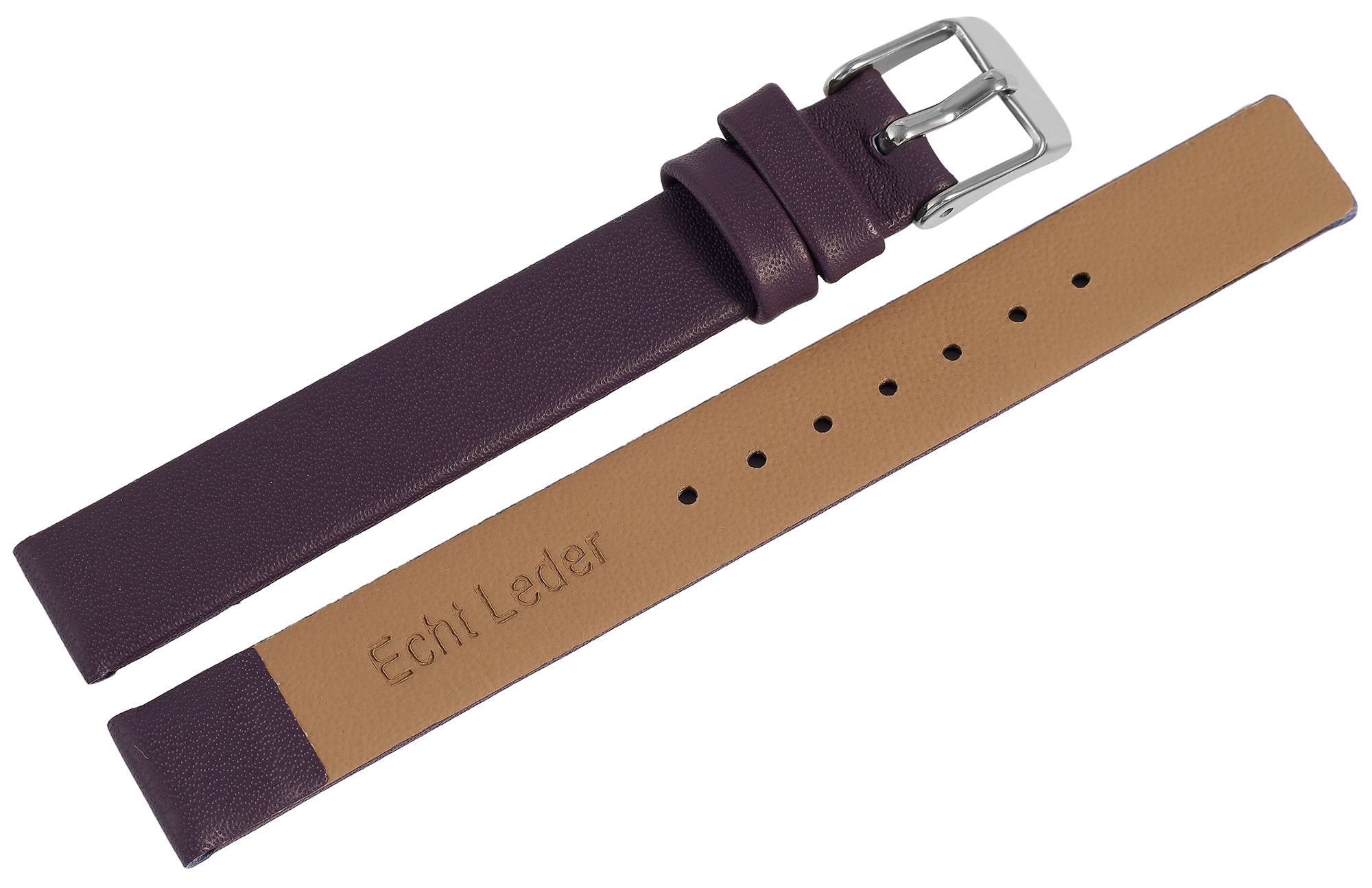 De paarsgekleurde horlogeband is gemaakt van echt leer en is verkrijgbaar met een breedte van 12, 14 mm, 16 mm, 18 mm, 20 mm en 22 mm. De totale lengte van het horlogebandje is tussen 20,5 cm en 22 cm en de materiaaldikte is 3 mm. De lengte is afhankelijk van de breedte van de lug. De vervangband kan worden geopend en gesloten met een zilverkleurige, hoogglans gepolijste gesp. De glanzende elementen van het bandje benadrukken het mooie ontwerp en geven je horloge een frisse look.