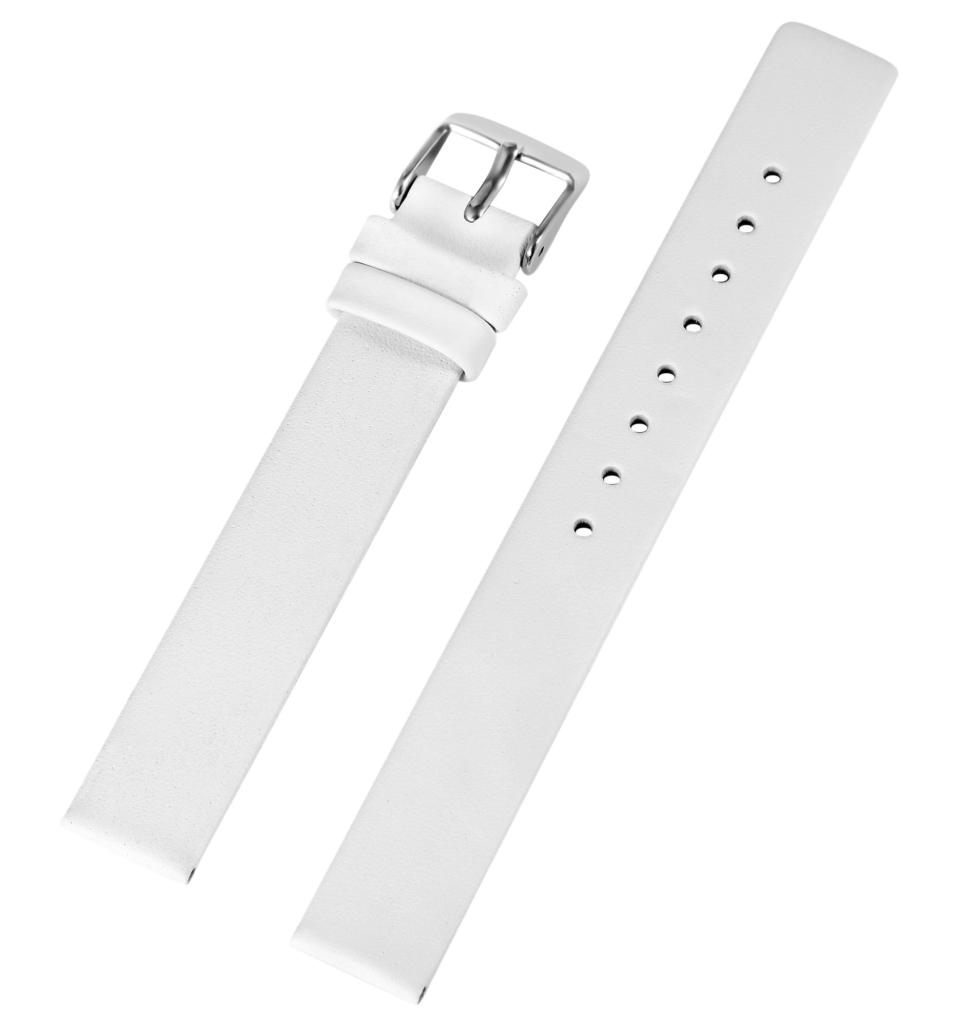 De witte horlogeband is gemaakt van echt leer en heeft een breedte van 14 mm. De totale lengte van het horlogebandje is 20 cm en de materiaaldikte is 2,5 mm. Het horlogebandje kan worden geopend en gesloten met een zilverkleurige, hoogglans gepolijste gesp. De glanzende afwerking in combinatie met het gladde leren horlogebandje benadrukt het mooie design van het horlogebandje en zorgt ervoor dat het snel en gemakkelijk om- en afgedaan kan worden.