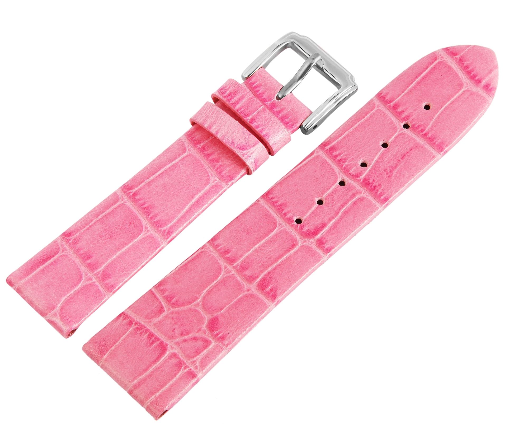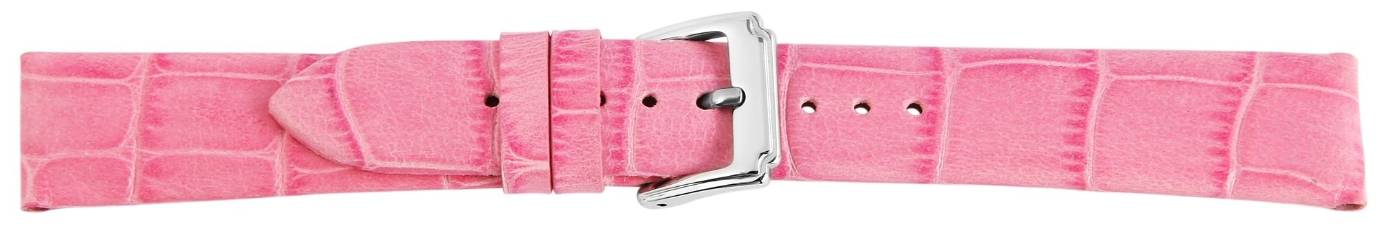 Klassieke vervangingsband van echt leer in de kleur roze. Het is gemaakt van het fijnste rundleer en heeft een alligatorleren ontwerp in reliëf. Het bandje heeft een brugbreedte van 16 mm, een zilverkleurige gesp en twee lussen. Het gaatjesgedeelte loopt taps toe tot een punt aan het einde.