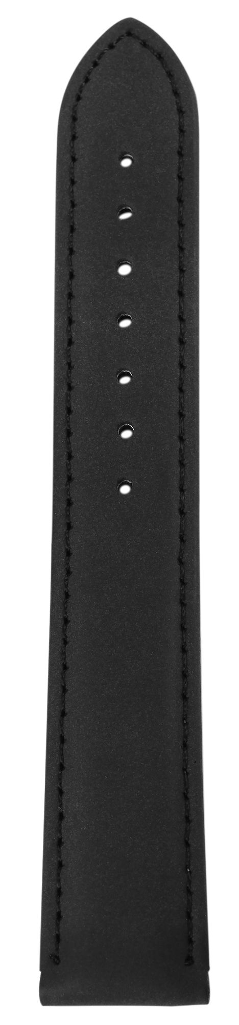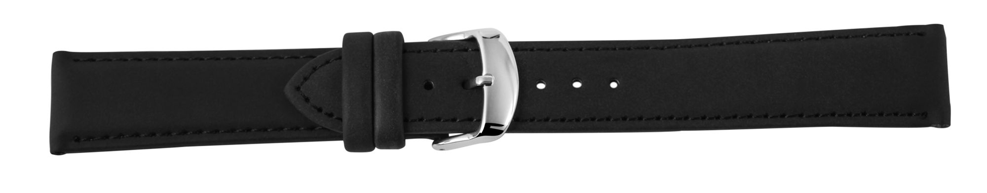 De zwarte horlogeband van echt leer heeft een breedte van 24 mm. Het is licht gewatteerd zodat het ongeveer 4 mm hoog is. Het leren horlogebandje heeft ook een licht geruwd oppervlak en is aan de buitenkant gestikt met een zwarte naad. De totale lengte van de riem is 21,5 cm. De lengte bestaat uit het 12,5 cm lange gatgedeelte en het 9 cm lange gespgedeelte. De beugel van de sluiting is 2 mm smaller dan de breedte van de beugel, omdat het bandje smal is. De vervangingsarmband kan worden geopend en gesloten met een zilverkleurige gesp.