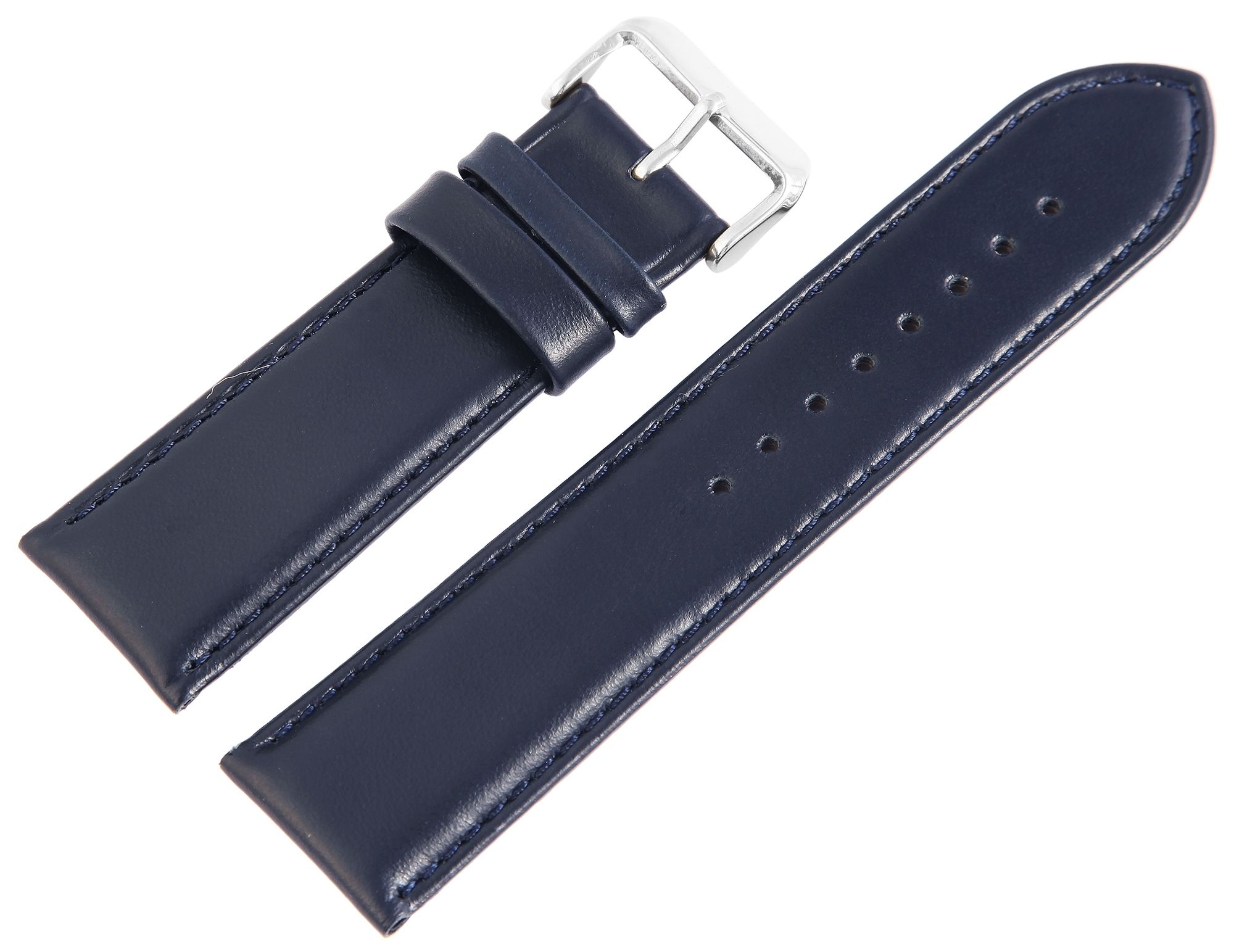 De donkerblauwe horlogeband, ook met donkerblauwe stiksels, is gemaakt van echt leer en is verkrijgbaar met een lugbreedte van 18 mm, 20 mm, 22 mm en 24 mm. De sluiting is 2 mm smaller dan de breedte van de lug, omdat de armband daar smaller is. De totale lengte van het bandje is 22 cm en de materiaaldikte is 5 mm. De vervangingsband kan worden geopend en gesloten met een zilverkleurige, hoogglans gepolijste gesp. De glanzende afwerking in combinatie met het gladde leren horlogebandje benadrukt het mooie design van het horlogebandje en zorgt ervoor dat het snel en gemakkelijk om- en afgedaan kan worden.