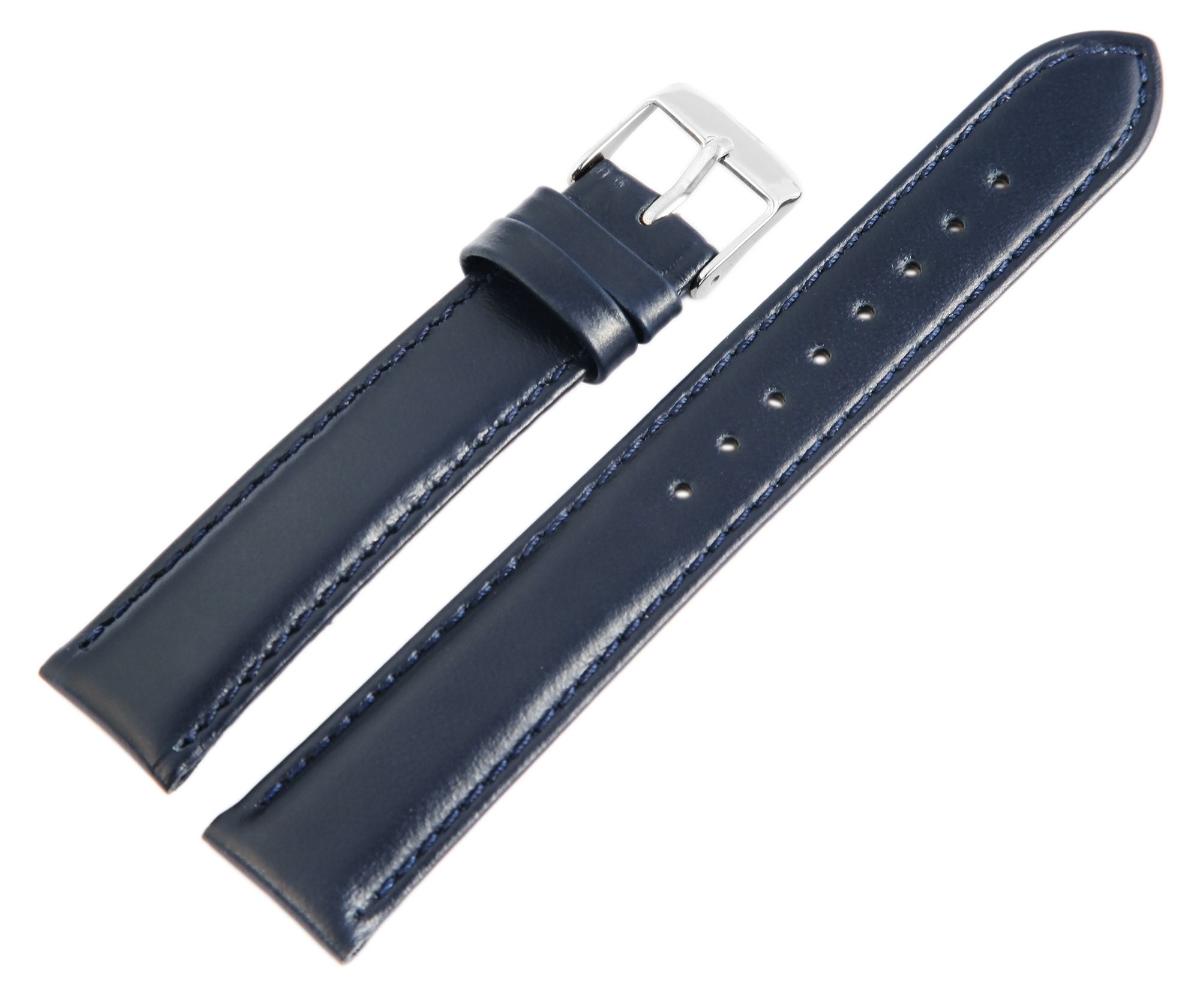 De donkerblauwe horlogeband, ook met donkerblauwe stiksels, is gemaakt van echt leer en heeft een lugbreedte van 18 mm. De sluiting is 2 mm smaller dan de breedte van de lug, omdat het horlogebandje daar smaller is. De totale lengte van het bandje is 22 cm en de materiaaldikte is 5 mm. Het vervangende bandje kan worden geopend en gesloten met een zilverkleurige, hoogglans gepolijste gesp. De glanzende afwerking in combinatie met het gladde leren horlogebandje benadrukt het mooie design van het horlogebandje en zorgt ervoor dat het snel en gemakkelijk om- en afgedaan kan worden.