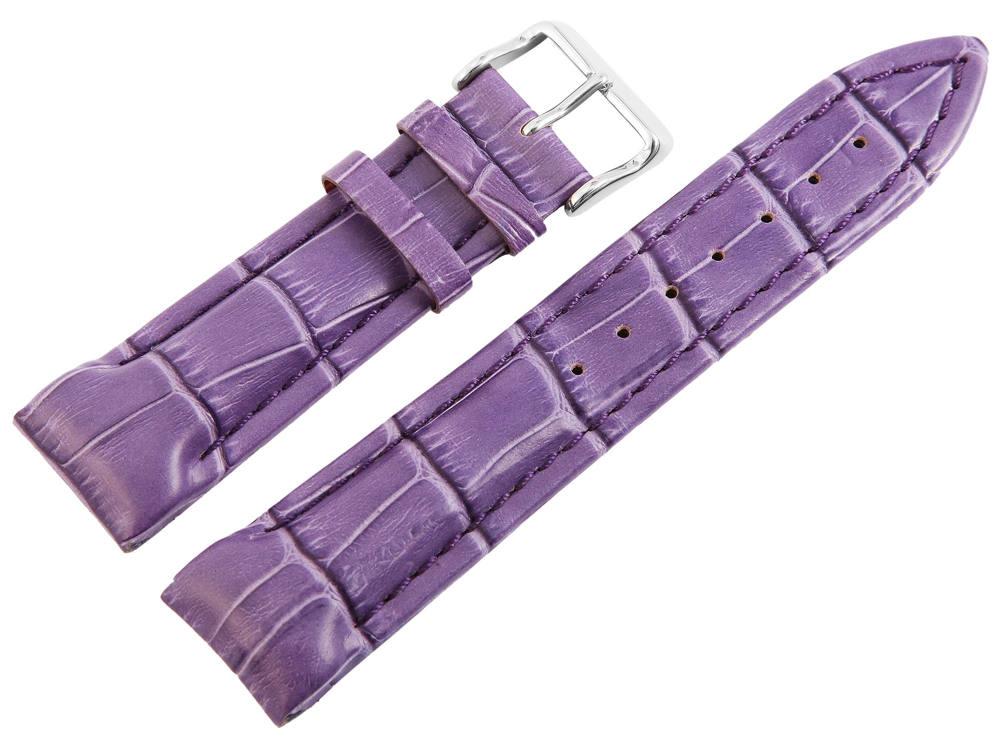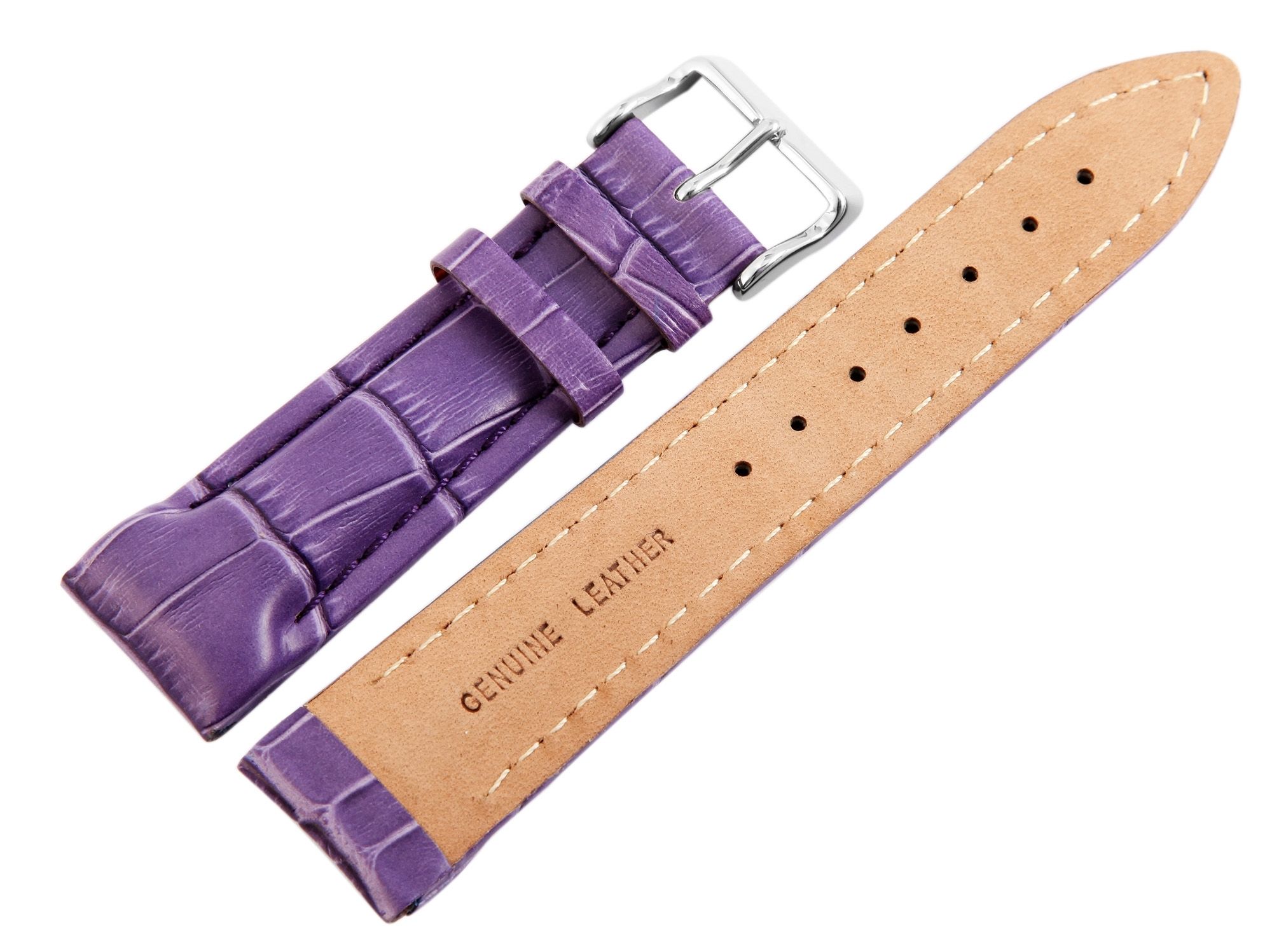 Klassieke vervangingsband van echt leer in de kleur paars. De buitenste naad is in dezelfde paarse kleur. Het scharnier is aan beide zijden opgevuld. Het is gemaakt van rundleer en heeft een alligatorleren ontwerp in reliëf. De riem heeft een brugbreedte van 22 mm, een zilverkleurige gesp en twee riemlussen. Het gaatjesgedeelte loopt taps toe tot een punt aan het einde.