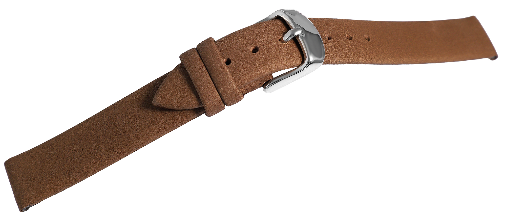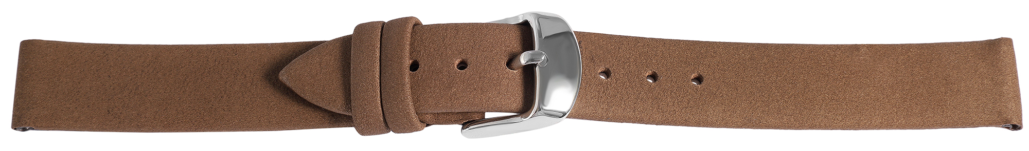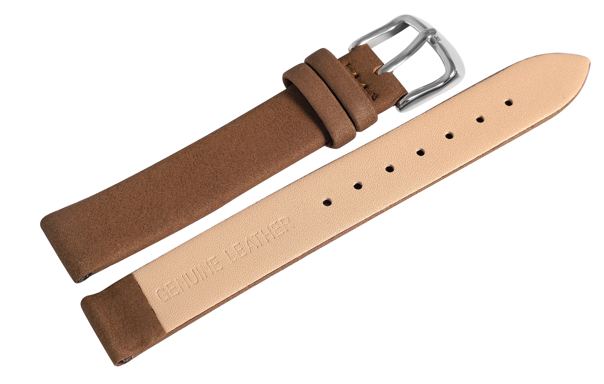 De bruine horlogeband is gemaakt van echt leer. De oppervlaktestructuur is licht geruwd en het is verkrijgbaar met een breedte van 12, 14, 16, 18, 20 en 22 mm. Het horlogebandje is ook 2 mm dik en de totale lengte van het bandje ligt tussen 19,5 cm en 20,5 cm. De lengte is afhankelijk van de breedte van de lug. Het vervangende horlogebandje kan worden geopend en gesloten met een zilverkleurige gesp.