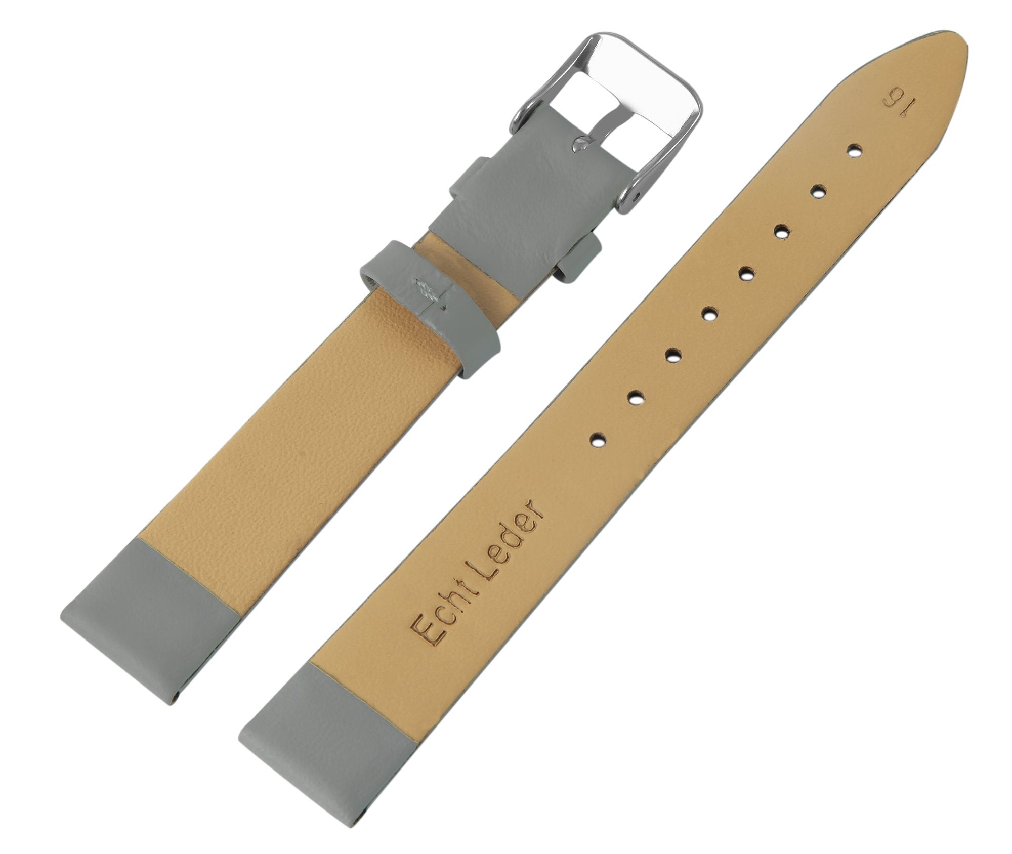Das graue Uhrenarmband wurde aus Echtleder gefertigt und es hat eine Anstoßbreite von 20 mm. Der Schließenanstoß ist 2 mm schmaler als die Anstoßbreite, da das Band dort schmaler zuläuft. Die Gesamtlänge des Bandes beträgt 20 cm und die Materialstärke beträgt 2,5 mm. Das Ersatzarmband lässt sich mit einer silberfarbenen, hochglanzpolierten Dornschließe öffnen und schließen. Das glänzende Finish in Kombination mit dem glatten Lederband unterstreicht das schöne Design des Uhrenarmbandes und sorgt für ein schnelles und leichthändiges An- und Ablegen.