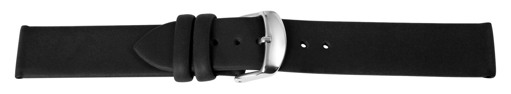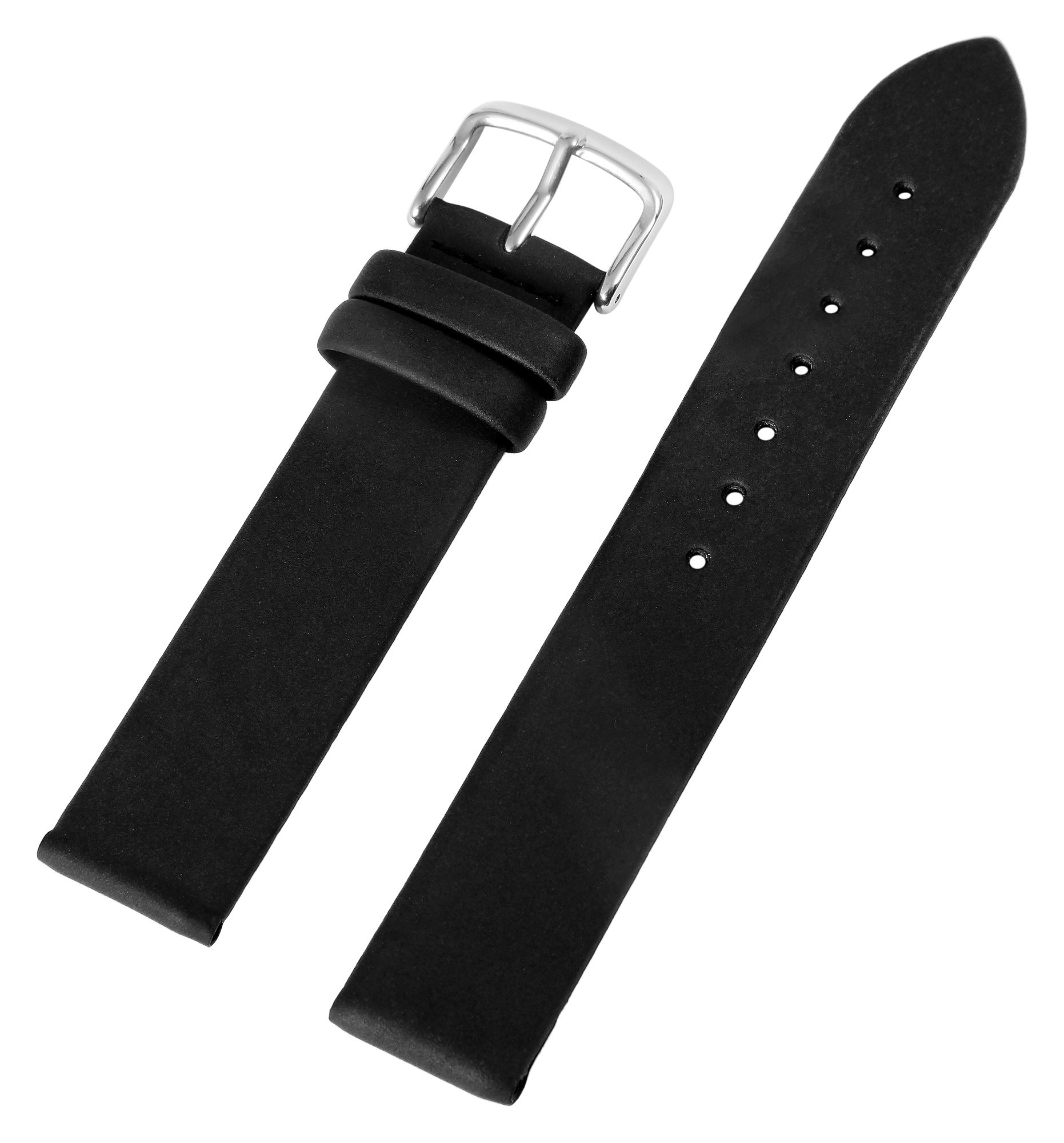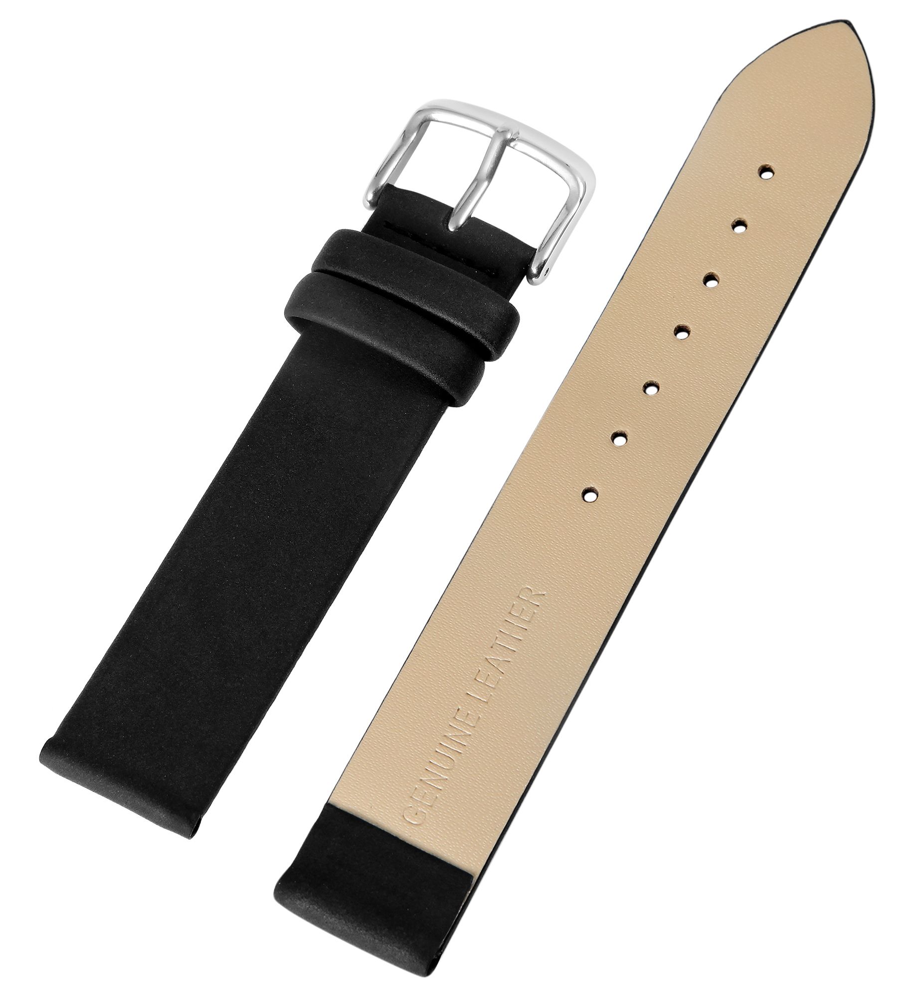 De zwarte horlogeband is gemaakt van echt leer. De textuur van het oppervlak is licht geruwd en het is verkrijgbaar met een breedte van 12, 14, 16, 18, 20 en 22 mm. Het horlogebandje is ook 2 mm dik en de totale lengte van het bandje ligt tussen 19,5 cm en 20,5 cm. De lengte is afhankelijk van de breedte van de lug. Het vervangende horlogebandje kan worden geopend en gesloten met een zilverkleurige gesp.