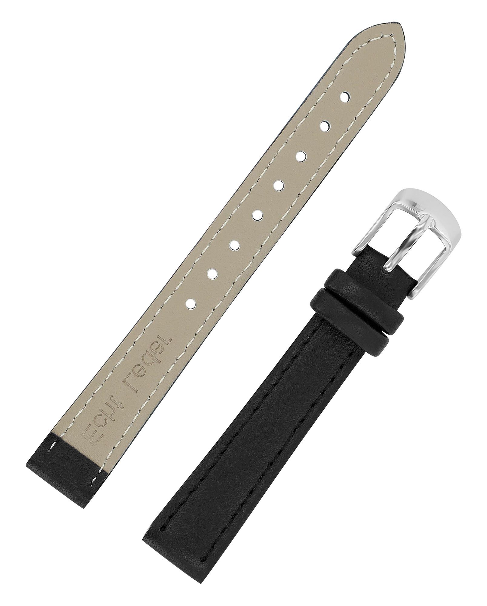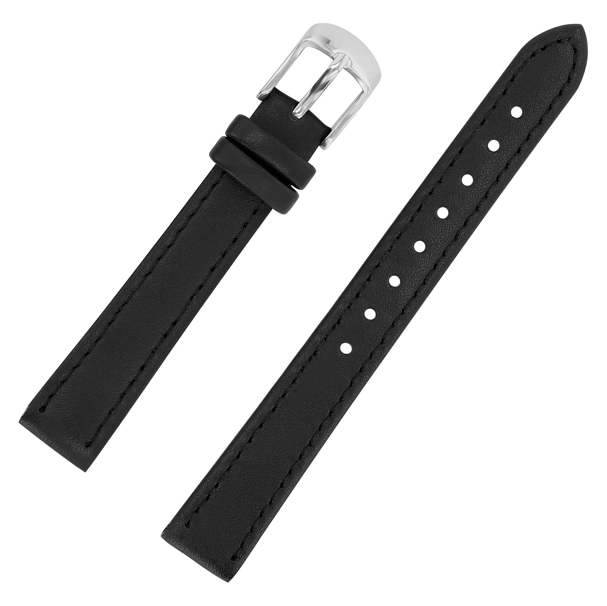 De zwarte horlogeband van echt leer is verkrijgbaar met een breedte van 10 mm, 12 mm, 14 mm, 16 mm, 18 mm, 20 mm, 22 mm, 24 mm en 26 mm. Het heeft een glad oppervlak en is afgewerkt met fijne zwarte stiksels. De materiaaldikte is 3 mm. De vervangingsarmband heeft een totale lengte tussen 19 cm en 21,5 cm. De totale lengte is afhankelijk van de breedte van de lug. De sluiting is 2 mm smaller dan de breedte van de lug, omdat het bandje smal is. Het kan worden geopend en gesloten met een zilverkleurige gesp.