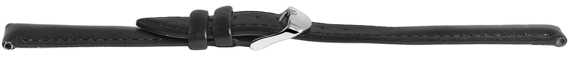 De zwarte horlogeband is gemaakt van echt leer en is verkrijgbaar met een breedte van 12 mm, 14 mm, 16 mm, 18 mm, 20 mm, 22 mm, 24 mm en 26 mm. Het heeft een glad oppervlak, is gewatteerd en heeft fijne zwarte stiksels. De materiaaldikte is 5 mm. De lug van de sluiting is 2 mm smaller dan de breedte van de lug, omdat het bandje taps toeloopt. De totale lengte hangt af van de breedte van de lug en varieert van 17,5 cm tot 21,5 cm. De vervangingsarmband kan worden geopend en gesloten met een zilverkleurige gesp.
