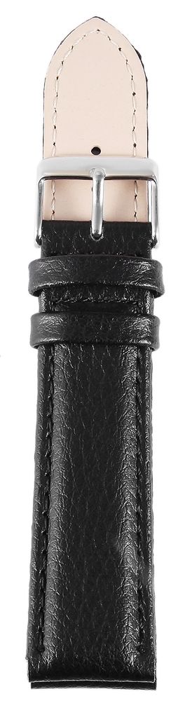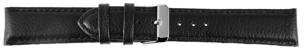 De zwarte horlogeband van echt leer is verkrijgbaar in de lugbreedtes 12 mm, 14 mm, 16 mm, 18 mm, 20 mm, 22 mm en 24 mm. Het leren horlogebandje is licht gewatteerd en heeft een materiaaldikte van ongeveer 4 mm. Het heeft een ruw oppervlak met een fijn reliëf en is aan de buitenkant versierd met zwarte stiksels. De totale lengte van het bandje is gebaseerd op de breedte van het bandje en varieert van ongeveer 19 - 21 cm. De sluiting is 2 mm smaller dan de breedte van het bandje, omdat het bandje taps toeloopt. Het vervangende horlogebandje kan worden geopend en gesloten met een zilverkleurige roestvrijstalen vouwsluiting.