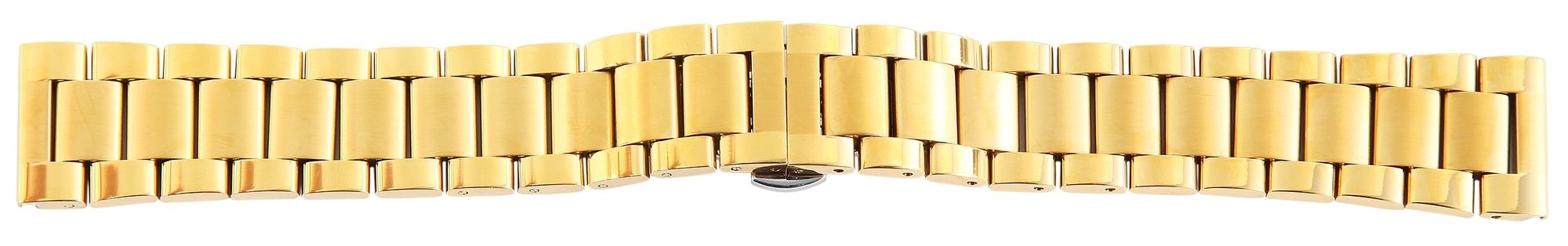 De goudkleurige horlogeband is gemaakt van roestvrij staal en kan worden geopend en gesloten met een goudkleurige vlindersluiting. Het heeft een lugbreedte van 18 mm. Het vervangende horlogebandje bestaat uit veel elementen die met weinig moeite kunnen worden verwijderd. Dit betekent dat het bandje aan elke pols kan worden aangepast. De individuele elementen bestaan elk uit drie afzonderlijke delen, die de roestvrijstalen armband een drie-rijig uiterlijk geven wanneer deze gemonteerd is. De twee buitenste randen zijn gepolijst en de middelste rij is mat. Dit type afwerking van het oppervlak geeft het schakelarmband een eenvoudige maar elegante uitstraling, waardoor het perfect bij elk horloge past. De totale lengte van de schakelarmband is 17,5 cm.