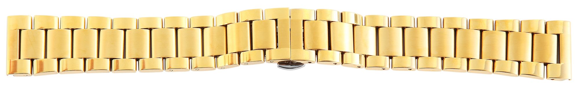 Das goldfarbene Uhrenarmband ist aus Edelstahl gefertigt und lässt sich über eine goldfarbene Butterflyfaltschließe öffnen und schließen. Es hat eine Anstoßbreite von 20 mm. Das Ersatzarmband setzt sich aus vielen Elementen zusammen, die sich mit wenig Aufwand entnehmen lassen. Damit ist das Band individuell auf jedes Handgelenk anpassbar. Die einzelnen Elemente bestehen jeweils aus drei Einzelteilen, die das Edelstahlarmband im zusammengesetzten Zustand dreireihig aussehen lassen. Die beiden äußeren Kanten sind poliert und die mittlere Reihe ist mattiert. Diese Art der Oberflächenbearbeitung lässt das Uhrenarmband schlicht, aber auch elegant wirken und passt sich somit perfekt an jede Uhr an. Die Gesamtlänge des Gliederarmbandes beträgt 17,5 cm.