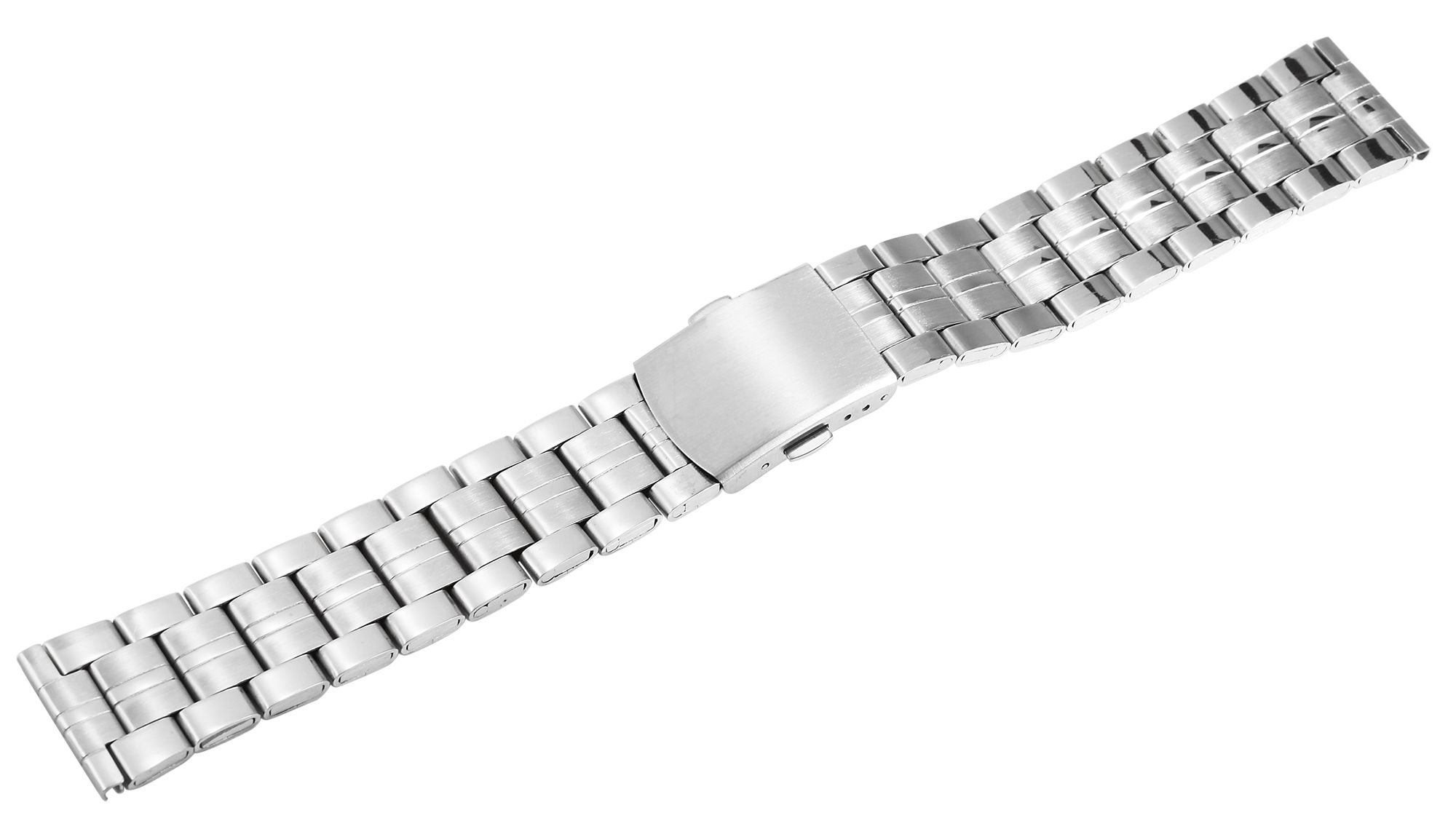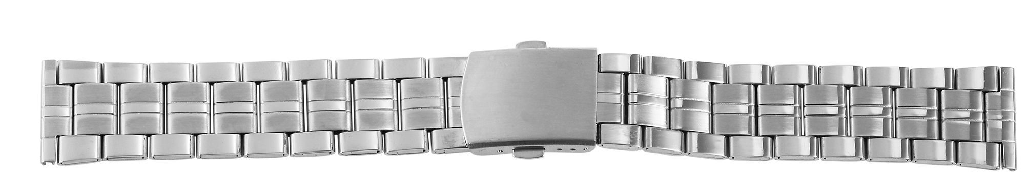 De vervangende horlogeband is gemaakt van roestvrij staal en kan worden geopend en gesloten met een zilverkleurige vouwsluiting. Het is verkrijgbaar met een lugbreedte van 18 mm, 20 mm en 22 mm. De lug is recht en daarom compatibel met elk horloge. Het vervangende horlogebandje bestaat uit veel elementen die met weinig moeite kunnen worden verwijderd. Dit betekent dat het bandje op maat gemaakt kan worden voor elke pols. De individuele elementen bestaan elk uit drie afzonderlijke delen, die de roestvrijstalen armband een drie-rijig uiterlijk geven wanneer deze gemonteerd is. De buitenste delen zijn gepolijst en de middelste rij is mat. Een bijzonder kenmerk is dat de middelste matte rij versierd is met een ca. 1 mm brede gepolijste lengtestreep. Door dit soort afwerking van het oppervlak past deze armband perfect bij elk horloge.