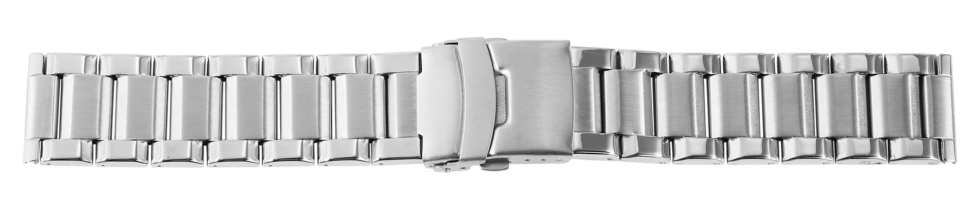 Klassieke schakelarmband van roestvrij staal. De bandbreedte is 24 mm. Het roestvrij staal is gepolijst, waardoor het er elegant en robuust uitziet. In combinatie met de bijpassende kast is deze armband de perfecte metgezel in alle situaties. Dankzij de vouwsluiting kan de armband snel en eenvoudig worden geopend. Dankzij de veiligheidssluiting is onbedoeld openen onmogelijk. De armband is bijzonder stevig dankzij de manier waarop de afzonderlijke schakels met elkaar verbonden zijn. De schakels zijn elk verbonden met ronde pinnen. Dit zorgt voor een hoge mate van aanpasbaarheid aan de pols en een comfortabele pasvorm.
