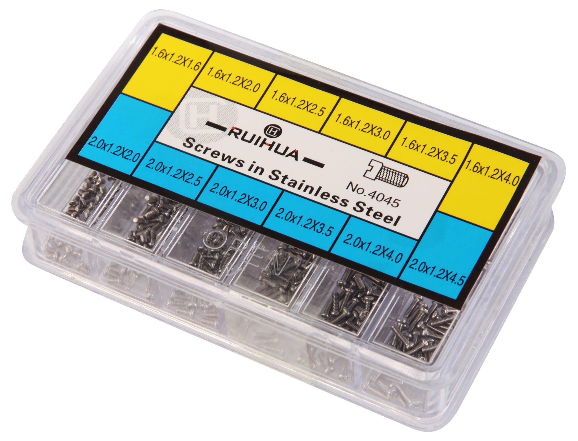 Het assortiment roestvrijstalen schroeven bevat schroeven in 12 verschillende maten. Alle schroeven hebben een schroefdraaddikte van 1,2 mm. Zes van de schroeftypes hebben een schroefkopmaat van 1,6 mm. Deze zijn vervolgens verkrijgbaar in lengtes van 1,6 mm, 2,0 mm, 2,5 mm, 3,0 mm, 3,5 mm en 4,0 mm. De andere 6 schroeftypes hebben een schroefkopgrootte van 2,0 mm en zijn verkrijgbaar in lengtes van 2,0 mm, 2,5 mm, 3,5 mm, 4,0 mm en 4,5 mm. Alle schroeven hebben een kruiskop. De schroeven zijn geschikt voor het sluiten van kastruggen, het bevestigen van bandjes of het uitvoeren van kleine reparaties aan bijvoorbeeld horloges, sieraden en accessoires.