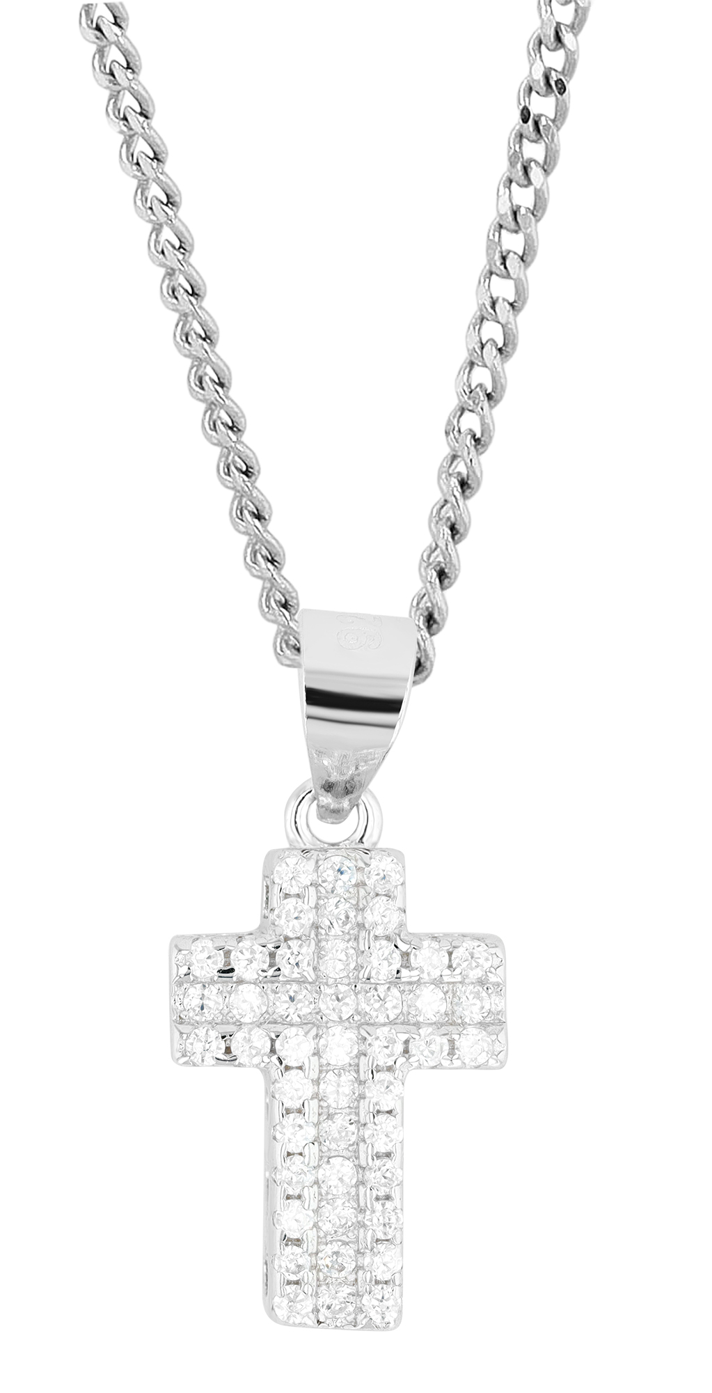 De elegante kruishanger is helemaal bezet met fonkelende zirkonia steentjes, die hem een bijzonder geraffineerde look geven. Met zijn sierlijke afmetingen van 16 x 11 mm en de praktische 5 mm oogsluiting is de hanger perfect om elke dag te dragen, maar ook voor feestelijke gelegenheden. De rhodiumplating biedt bescherming tegen aantasting en zorgt voor een glanzende afwerking, een accessoire dat klassieke elegantie combineert met moderne accenten.